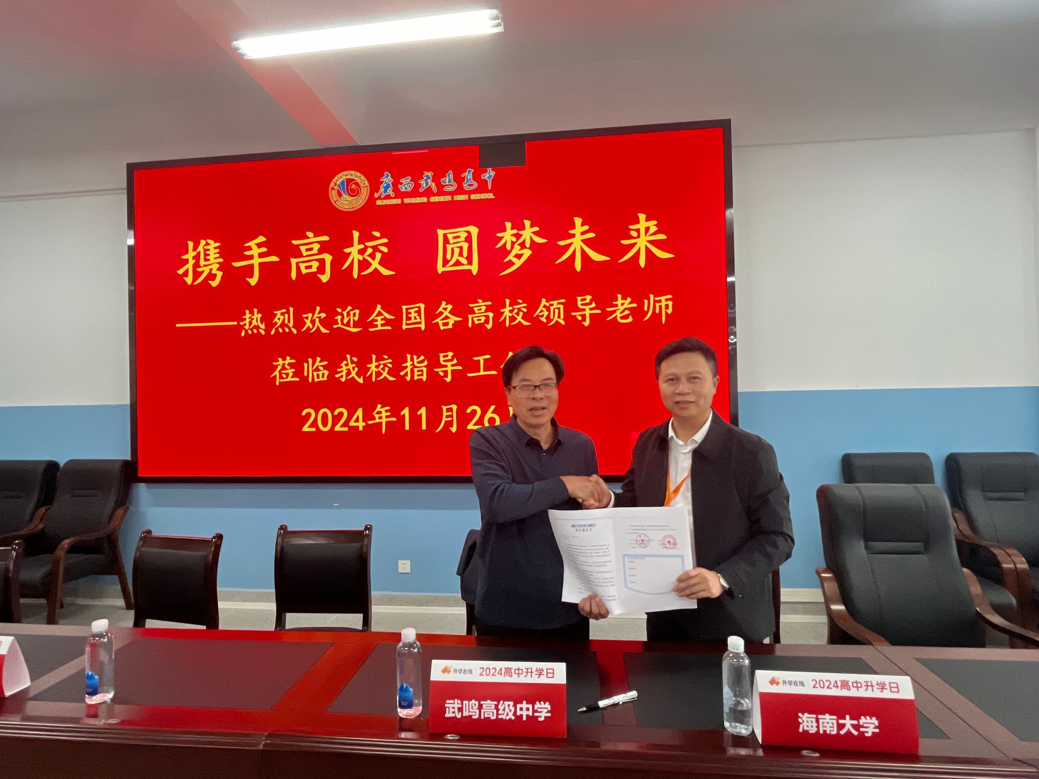 招生宣传组先后到南宁市武鸣区武鸣高级中学、广西宾阳中学、桂平市浔州高级中学、玉林市北流中学等4所重点中学,与4所重点中学负责人签订优质生源基地协议书,同时向学校领导和学生介绍黑料正能量 “三大改革”和近几年取得的快速发展成就。