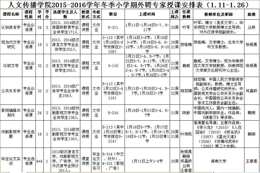 人文传播学院2015-2016学年冬季小学期外聘专家授课安排(1.11-1.26)