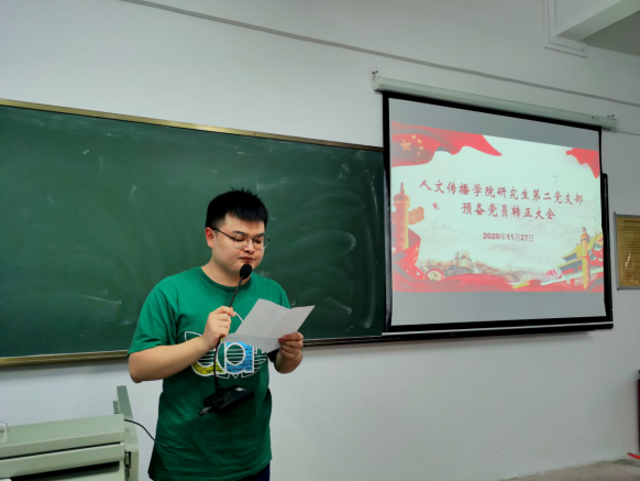 11月27日下午,人文传播学院研究生第二党支部在2教101教室召开预备党员转正大会,会议由党支部书记宋鸽主持。