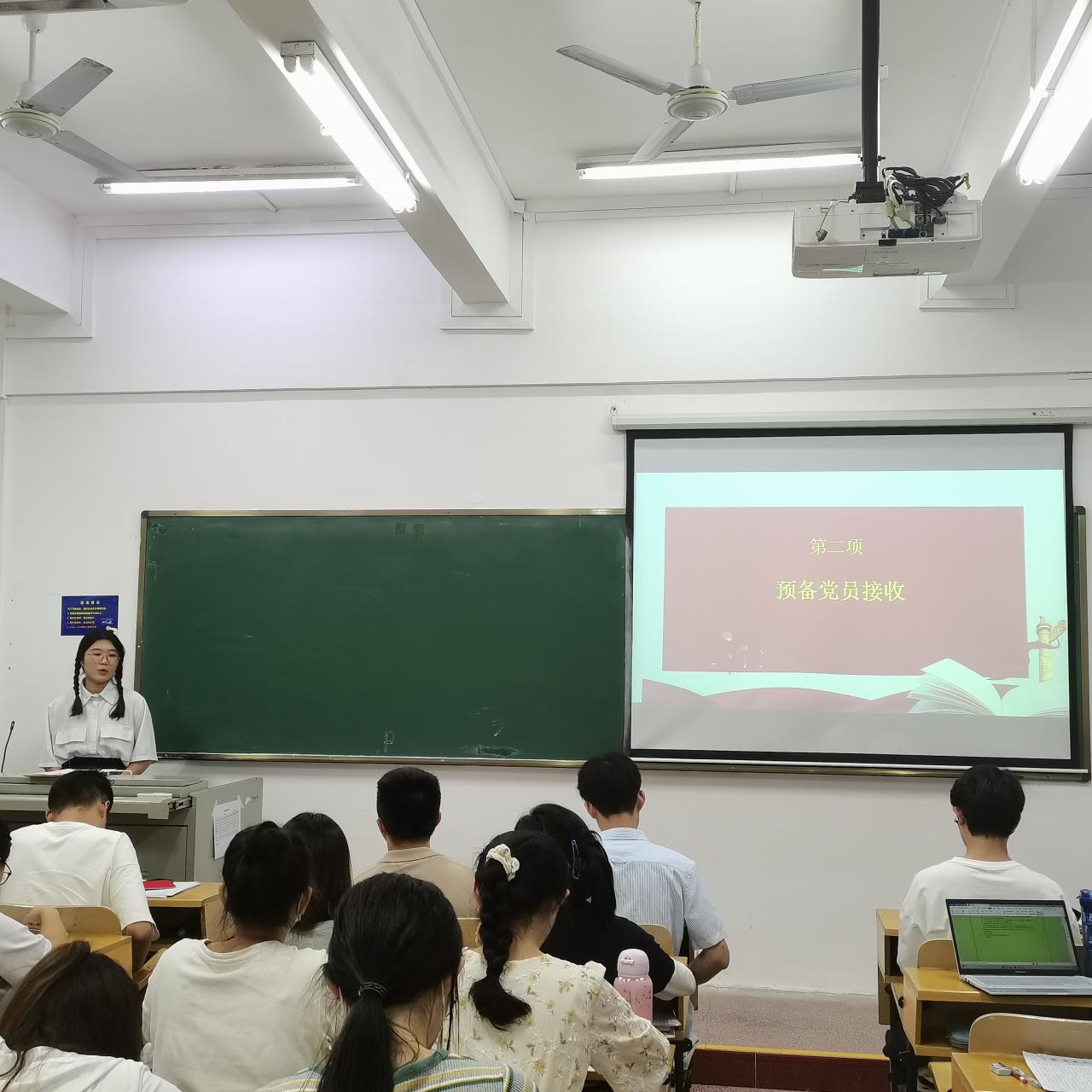 会议第二项,预备党员接收。赵伟诚等9位发展对象依次进行发言,就发展期间的学习、思想、工作方面进行自我陈述,接受支部大会考核。各位发展对象在学习上,不断扎实提升学习党的理论水平和学科专业知识,大量阅读与专业有关的文献作品,以及《共产党宣言》等马克思主义经典原著。同时注意综合素质的提高,在思想上端正入党动机,不断坚定信念,关注《光明日报》、《人民日报》等主流官媒及时了解党的最新方针政策,以及国内外时事热点。工作方面在各个组织内认真负责,参与多样实践、志愿活动,在校内参与文明交通、征兵讲座、书院制宣讲、爱心围巾、无偿献血等;在校外参加善行100募捐、海潮乡村支教、小学无偿家教等等。部分同志总结成果同时也提出缺点与不足,如外出志愿不够大胆,偶尔急躁,成绩不够优异等等。