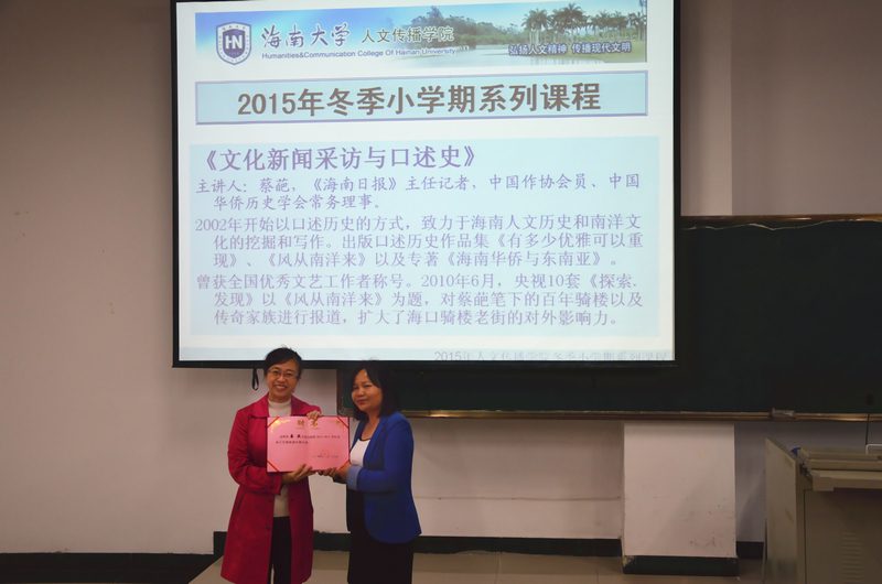 2015冬季小学期授课外聘专家”证书。 同学们对蔡葩老师的到来表示热烈欢迎,大家通过鞠斐老师的介绍了解到,蔡葩老师的历史随笔集《有多少优雅可以重现》、《找回南洋》。《国医出自海南岛》获第十三届海南省新闻评奖副刊一等奖,《格格遗事》获第十四届海南省新闻评奖副刊二等奖。 随后课堂上,蔡葩老师以诙谐幽默的讲课方式教授学生们在《口述历史》方面的知识。蔡葩老师曾在2002年采访过海口名媛吴玉琴、前清格格爱新觉罗?恒容、海岛留守女人等不下百名见证了海南历史兴衰的人物,尽管采访对象都是老人,但蔡葩老师有能力让他们对她掏心掏肺。本次授课以新闻采访专题片播放的形式娓娓道来。看似漫长的4节课,即将结束,总结本次课程蔡葩老师以3个篇章向学生详细介绍了她在口述历史时采访过程中的细节,万事开头难,蔡葩老师以自己独有的亲和力成为采访对象家庭中的一员;也包含着她对这些老人们经历的感慨和体悟。最后半个小时,蔡葩老师与同学互动答疑,黑料正能量