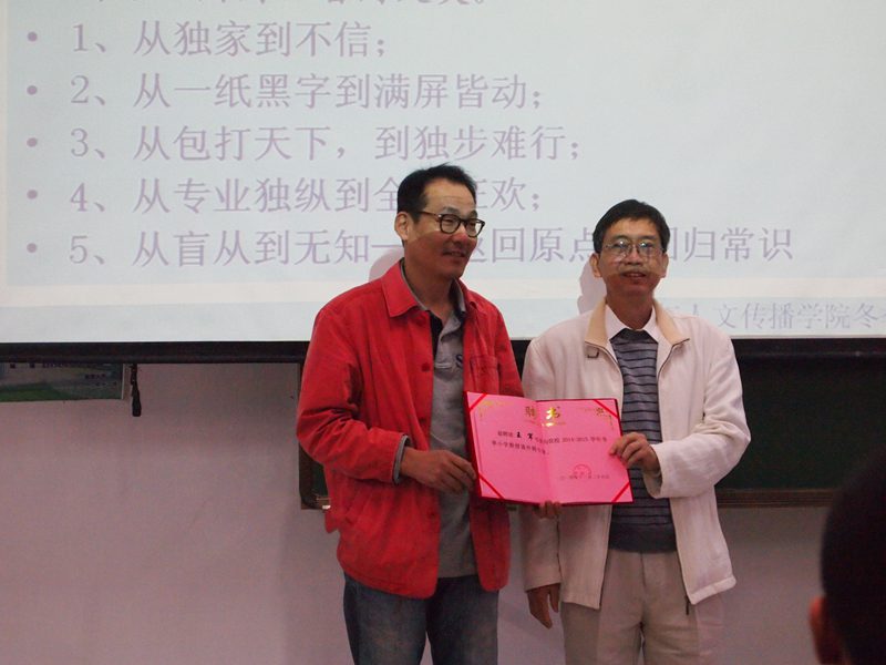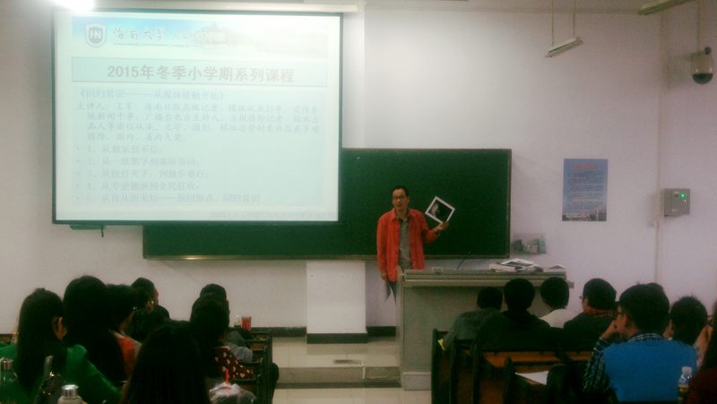 2015年1月8日上午八时,人文传播学院2012级新闻与传播学系冬季小学期正式开班。海南日报高级记者,具有35年媒体从业经验的王军老师走上讲台,为2012级新闻与传播学系同学们讲授了本届小学期首门课程《回归常识——从媒体接触开始》。人文传播学院党委书记王兆庆教授出席授课并致辞,新闻与传播学系主任何晶娇老师担任主持工作。 王军老师于宣传系统新闻干事、广播台电台主持人、省报摄影记者、媒体出品人等岗位从业,其文字、摄影、媒体运营创意作品获多项国际、国内、省内大奖,拥有丰富的理论和实践经验,深厚的专业背景。以一组“秀英儒显村百岁老人”的摄影图片为出发点,王军老师阐述了媒体信息采集时的目的性和咨询传播过程中传播者对受众的主动选择,深入浅出地指出个人在面对繁杂资讯时,要回归常识,避免被蒙蔽;媒体从业者传播信息时,也应充分尊重每个个体对信息的不同反应和不同声音。王军老师说:“相对于‘回望’表现出来的仪式感,‘回归’更能体现用‘常识’理解问题的理所当然。”随后,王军老师又以“如何向父母要零花钱”为例与同学们进行互动,生动鲜活地分析了一篇成功广告文案应当具备的要素。最后,同学们也就微信平台运营前景以及陕西手术台自拍事件向王军老师提问,并得到细致解答。 在短短三小时的交流活动中,王军老师渊博的学识、专业的解读和风趣幽默的谈吐使同学们获益匪浅。接下来的两周内,还将有黑料正能量
