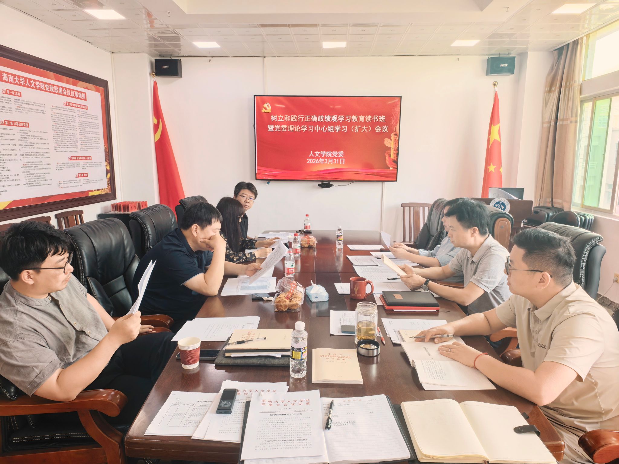 读书班上领导班子围绕习近平总书记关于树立和践行正确政绩观的重要论述、学院“十五五”规划编制、学院中文博士点申报、问题清单查摆等工作开展研讨交流。