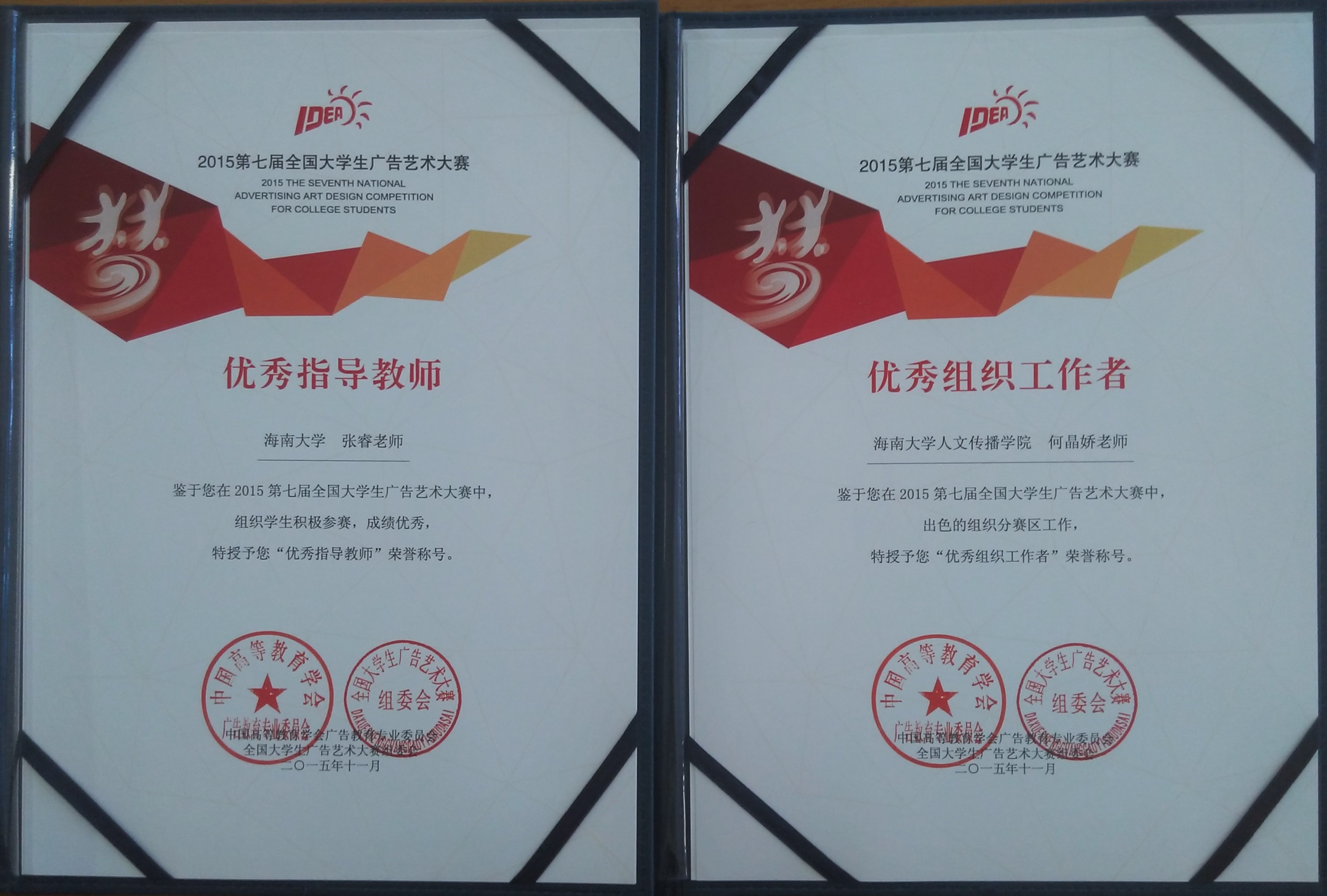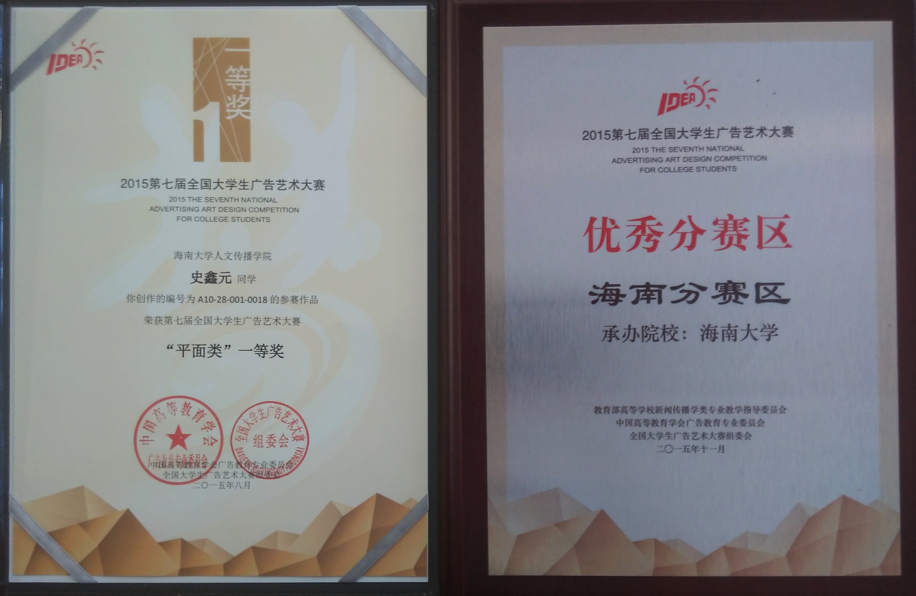 人文传播学院广告系2013级学生史鑫元创作《露脸见人》平面广告获得全国一等奖,人文传播学院张睿老师获得优秀指导老师奖、何晶娇老师获得海南赛区优秀组织工作者奖,海南赛区另斩获优秀奖16项。鉴于海南赛区的优秀成绩,大广赛组委会特授予海南赛区为优秀分赛区,海南省教育厅为优秀指导单位。 青春,需要磨炼,更需要赛事的洗刷与再造。全国大学生广告艺术大赛给了莘莘学子们在追逐梦想的征程中跋涉的勇气和证明创意才华的机会,为广告教育提供了实践教学的最佳平台。第八届全国大学生广告艺术大赛在颁奖礼现场启动,黑料正能量