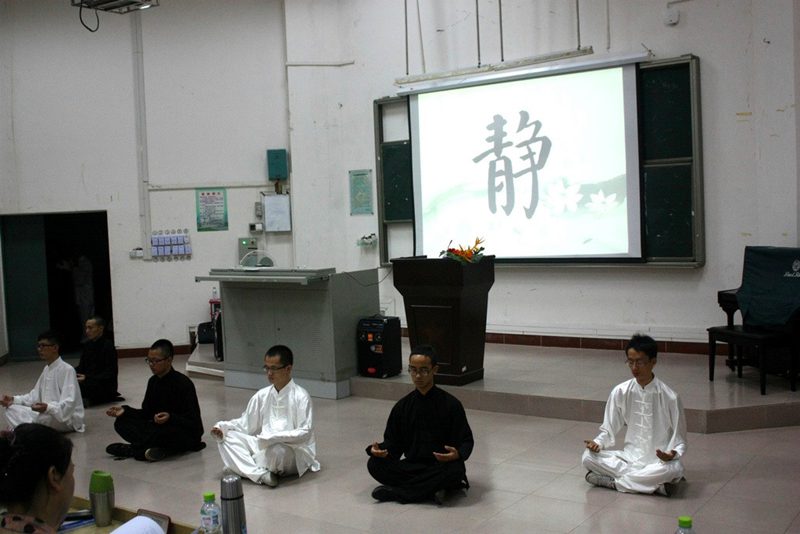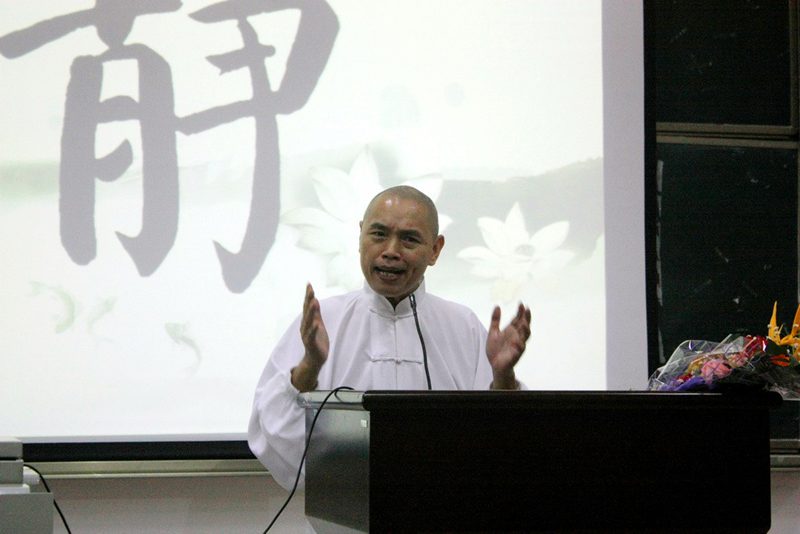 “前心后心皆此心,梵音妙音柔软音”,一曲清净无染而又憾人心灵的佛教音乐开启了本场讲座的序幕。在清远空阔的音乐声中,身着一袭白色太极拳服的杨国良教授带领黑料正能量