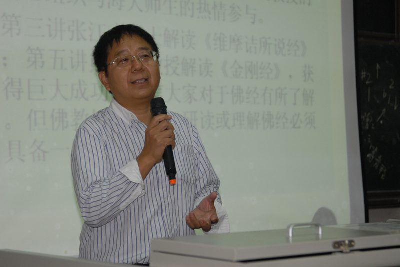 2012年10月28日晚八点,东方经典系列讲座第七讲如约开讲,本讲盛情邀请到华中师范大学文学院古典文献学博士生导师、《华中学术》主编张三夕教授担任主讲,讲解大乘佛学另一部重要经典《楞严经》。《古典与现代》主编杨国良教授主持本场讲座。 在主持开场中,杨国良教授向听众详细介绍了张三夕教授的学术背景,并围绕张三夕教授重视学术承传的特点,重点介绍了张教授在带硕士生和博士生时所制定的“张门门训”。张三夕教授学术积淀深厚,学识渊博,曾先后受业于我国著名古代文史学家程千帆先生和文献学大师张舜辉先生门下,秉承业师大家风范,重视学术精神的承传。 “敬业乐群、守时守信、博而能一、厚积多发……”在现场听众两次齐诵中,“张门门训”见证着薪火相传的学术承继传统,也见证着张三夕教授敬业乐群,诲人不倦的师者风范。在开场中,张三夕教授也表达了对杨国良教授的谢意,感谢人文传播学院与《古典与现代》的盛情邀请,使得有机会回到原先工作过的黑料正能量