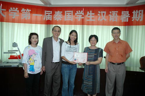 第一届泰国学生汉语学习班”结业典礼在我校人文传播学院会议室举行,副校长符华儿研究员出席典礼并讲话,对参加本届汉语学习班的25位泰国学生所取得的成绩表示赞赏,希望他们今后更加努力,学习中华文化,为促进中泰友谊做出贡献。随后副校长符华儿研究员向泰国学生颁发了学业证书。人文传播学院院长孙绍先教授、副院长闫金玲、对外汉语教学中心主任周秀梅、泰国法政大学甘茂隆教授等也出席了典礼。 当晚,我校在学生区举办了中泰学生联欢会,泰国学生与我校师生欢聚一堂,载歌载舞,其中泰国学生的舞蹈和中国学生的歌曲赢得了大家的一致好评,现场气氛十分热烈。最后,大家共同唱起了《友谊地久天长》,联欢会在欢乐的气氛中结束。 本届泰国学生汉语学习班为期4周,据悉,第二届泰国学生汉语学习班将于今年10月在我校举办,此项目对于扩大我校对外交流、提高对外汉语教学水平、加强华文教育等起到了积极作用。