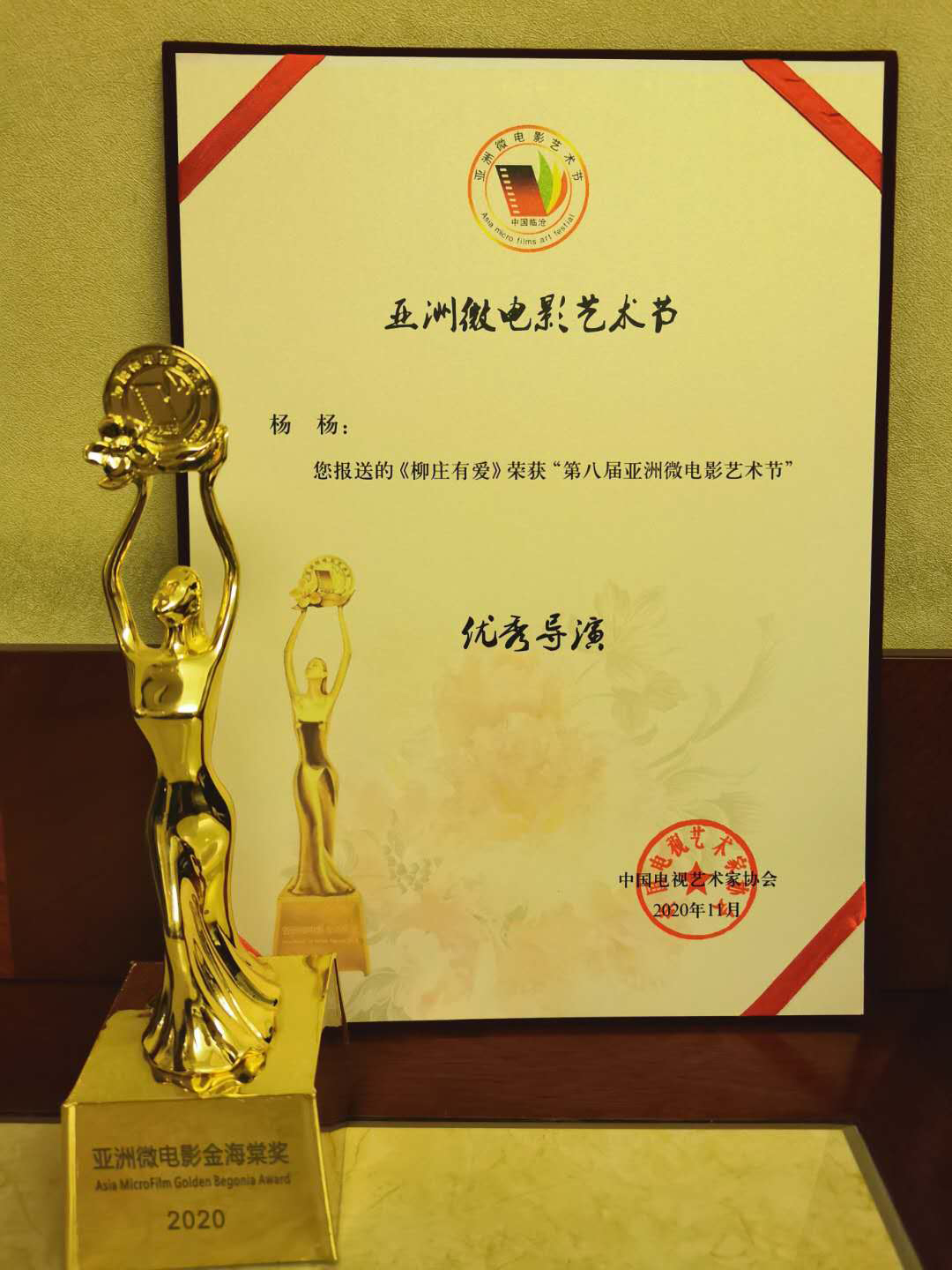 青年教师杨扬编剧导演的《柳庄有爱》一举斩获第八届亚洲微电影艺术节金海棠奖“优秀作品奖"和“优秀导演奖”两个奖项。