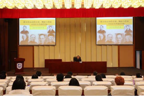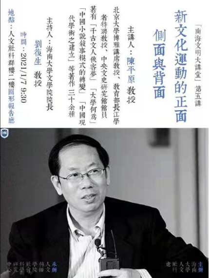 社科群楼二楼圆形报告厅开展由陈平原教授主讲的“南海文明大讲堂”第五讲:新文化运动的正面侧面与背面。由人文传播学院院长刘复生教授主持。本次讲座共有来自学院各年级各专业百余名同学参加,按照疫情防控要求,同学们佩戴口罩,有序入场,隔位就坐,倾听讲座。