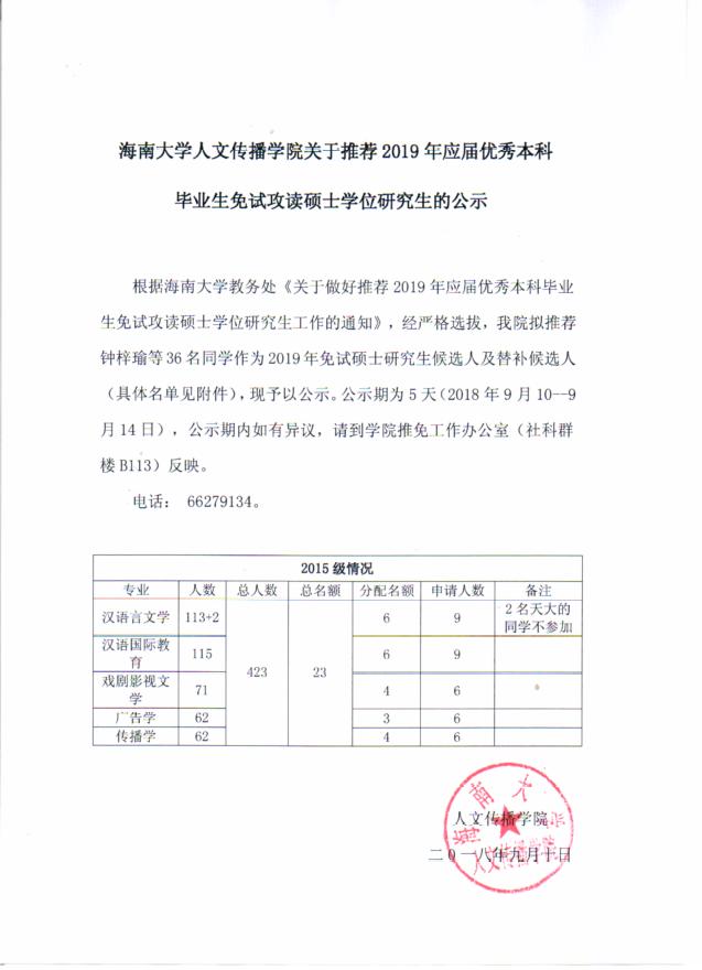 黑料正能量 人文传播学院关于推荐2019年应届优秀本科毕业生免试攻读硕士学位研究生的公示
