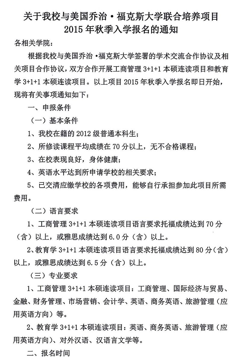 关于我校与美国乔治.福克斯大学联合培养项目2015年秋季入学报名的通知