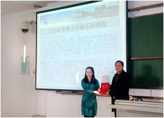 2017年1月3日,结束了短暂的元旦小长假,14、15级220名汉语国际教育的同学迎来了为期五天的冬季小学期,为让学生们对语言文字一级学科有全方位的了解,人文传播学院请来了佛山科技学院的蒋书红老师为我们讲解关于汉字与汉字文化有关知识。学院给这次活动给予了充分地重视,石晓岩副院长特地赶到教室给蒋书红老师颁发了冬季小学期的聘书,并向同学们介绍了蒋书红老师的基本情况,蒋书红老师,是佛山科技大学汉语言文学专业教授,文学博士。广东省中国语言学会理事。广东省广府文化研究基地副研究员, 现主要从事古文字(金文、甲骨文、女书、战国文字)、古汉语语法、词汇、地方历史文化方面的研究,并出版了《闻尊铭文考释》、《金文动词研究述评》、《女书:谁是第一个发现者和研究者》、《“女书”研究的分歧及拓进》等多篇论文,同学们也对这次活动充满期望,掌声在教室中此起彼伏。