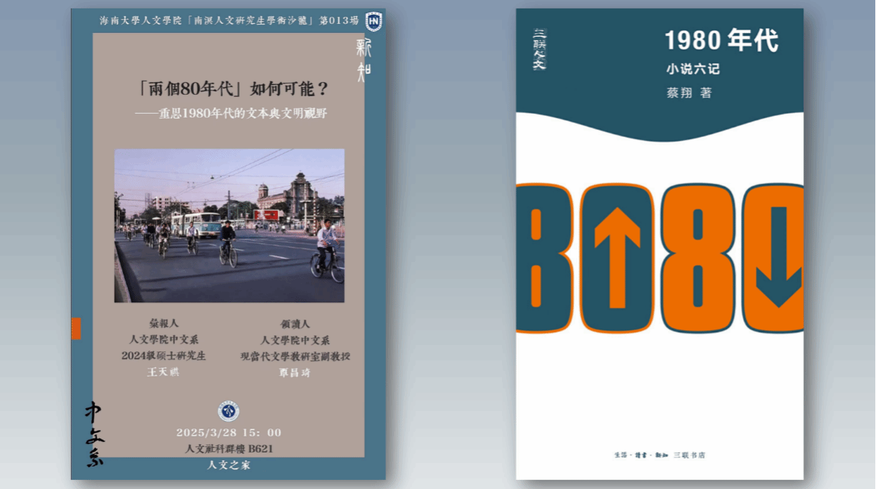 3月28日下午, “南溟人文研究生学术沙龙”第13期暨“新知读书会”第一期在学院人文之家开讲。本期主题为“‘两个80年代’如何可能?——重思1980年代文本与文明视野”, 围绕蔡翔老师新著《1980年代:小说六记》展开研讨。本次读书会由教研室覃昌琦老师领读并主持,2024级硕士研究生王天祺同学做读书汇报,教研室老师、研究生、本科生进行了热烈的讨论。