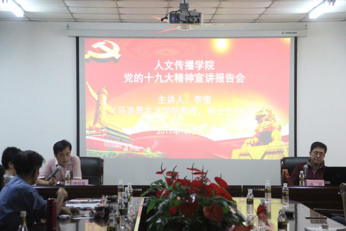 人文传播学院于海甸校区社科楼B719会议室举行党的十九大精神宣讲报告会。特邀马克思主义学院硕士生导师李俊教授作宣讲报告。学校特邀党建组织员林廷玖受邀出席,人文传播学院理论学习中心组成员及全体师生党员参加了本次报告会。会议由院党委书记华世佳主持。 会议伊始,华世佳代表全体与会人员对李俊教授的到来表示热烈欢迎和衷心的感谢。随后,李俊教授为大家进行党的十九大报告的解读,他将报告浓缩成100个关键词,进行全面深入的分析解读,他提到,党的十九大是在全面建成小康社会决胜阶段、中国特色社会主义进入新时代的关键时期召开的一次十分重要的大会,在党和国家事业发展史上具有重大里程碑意义,习近平总书记的工作报告总结了过去五年的显著成就和历史性变革,明确了新时代中国共产党的历史使命,在党的历史上、新中国发展史上和中华民族发展史上都具有开创性、划时代意义。此外,在提到“加快一流大学和一流学科建设,实现高等教育内涵式发展”时,李俊教授强调,要以党的十九大精神为指导,抓住报告中“加快”和“内涵式发展”这两个关键词,学习世界一流名校,加快推进“双一流”建设工作。 最后,按照10月27日校党委书记武耀廷在全校中层干部学习党的十九大精神宣讲会上的指示,华世佳就黑料正能量
