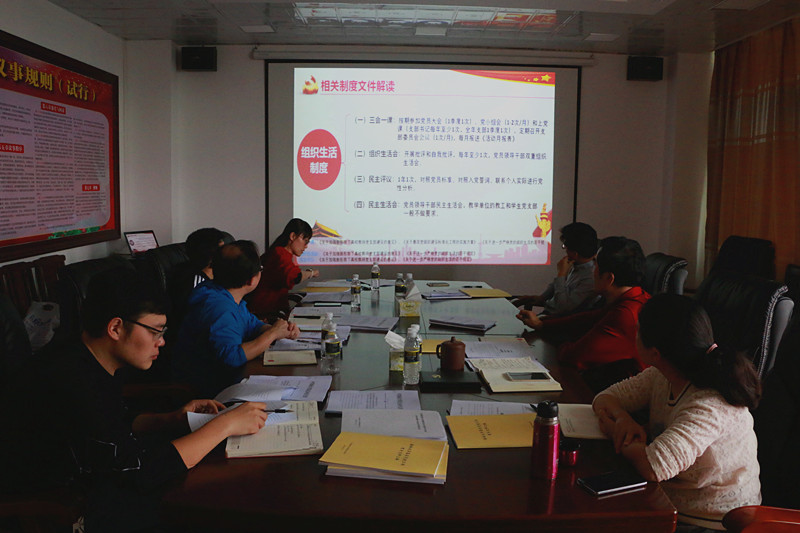 基层党建工作有关文件汇编》等学习资料进行了学习。特别对党的组织生活制度、队伍建设、日常管理、党费收缴等内容进行了学习与强调。华世佳指出,各位党支部书记要以身作则,在提高自身党建理论知识与工作能力的同时,组织带领支部党员积极开展“两学一做”学习教育,严格执行“三会一课”学习制度,建立健全党支部“3个名册”、“4个计划和总结”、“5个记录”、“6类档案”等信息管理制度,按照“六好”的标准创建规范化示范党支部。