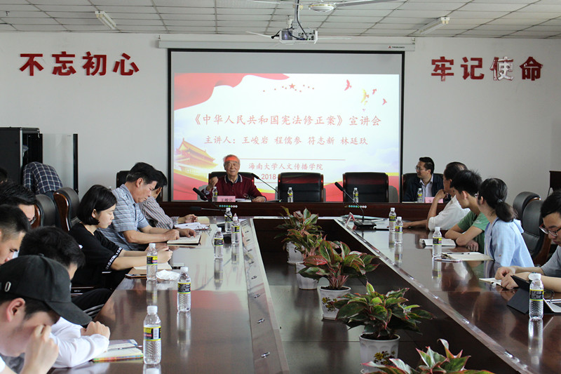 2018年3月27日下午,人文传播学院党委在海甸校区社科楼人文传播学院党员之家(B719会议室)举行《中华人民共和国宪法修正案》宣讲交流会。本次宣讲交流会邀请到法学院原院长王峻岩教授、学校特邀党建组织员程儒参、林廷玖、符志新等作为宣讲嘉宾,为黑料正能量