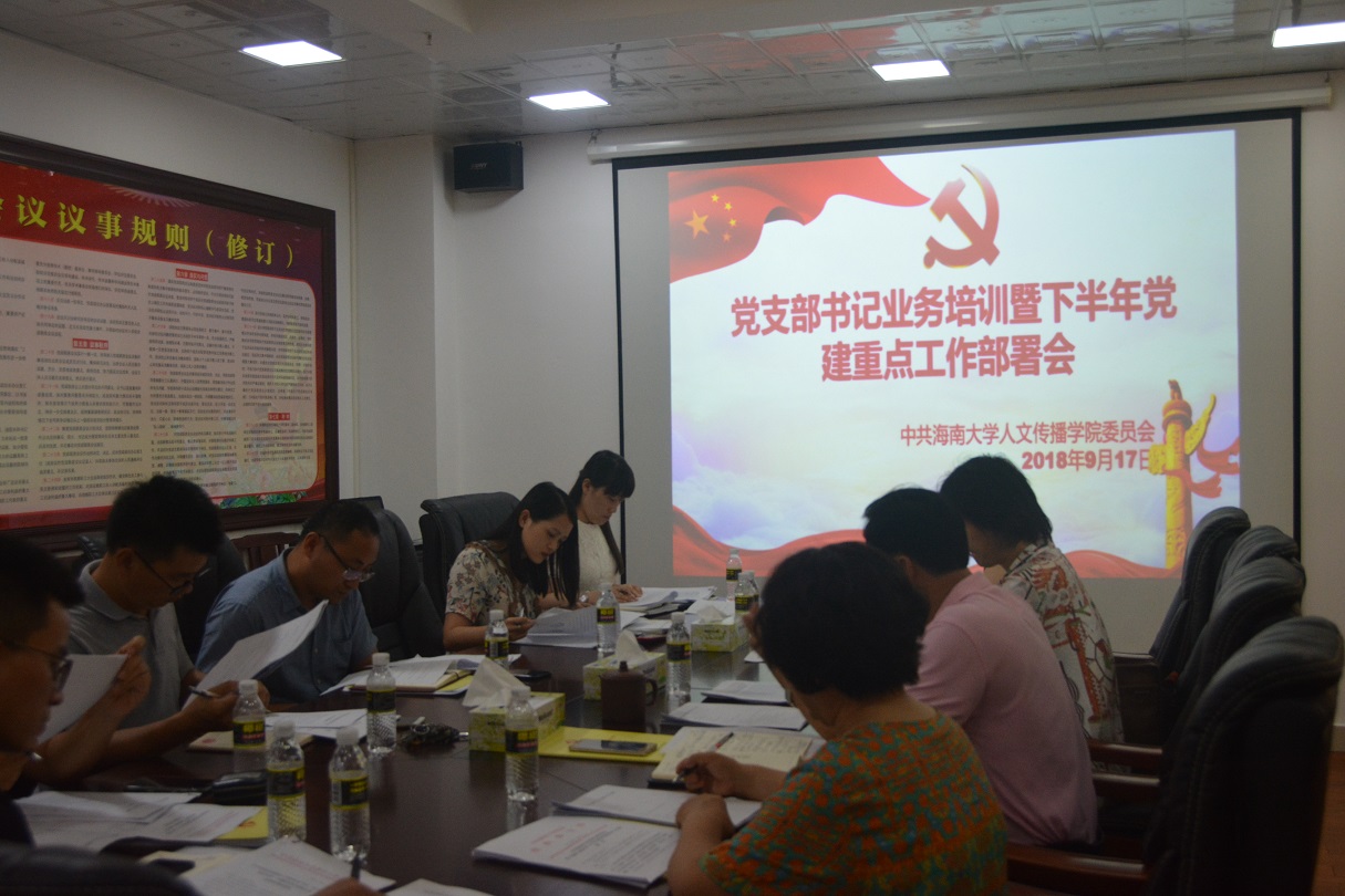 9月17日下午,人文传播学院党委在社科楼B615会议室召开党支部书记业务培训暨下半年党建重点工作部署会,会议由学院党委书记华世佳主持,党委副书记孙晓媛、党委委员、各党支部书记、党务工作联系人参加会议。
