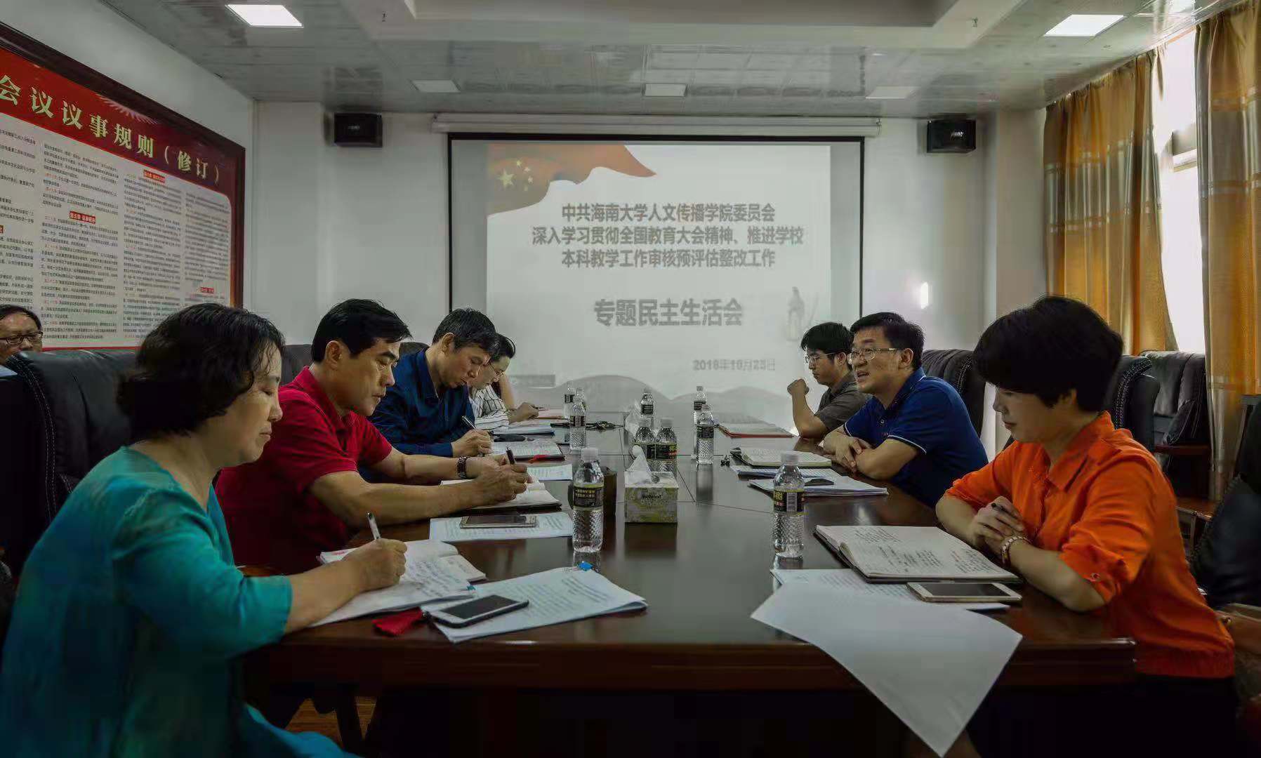 2018年10月25日下午,人文传播学院深入学习贯彻全国教育大会精神、推进学校本科教学工作审核预评估整改工作专题民主生活会在社科楼B615会议室召开,校党委常务副书记廖清林到会指导。学院党委书记华世佳、院长刘复生、院党委副书记孙晓媛、副院长石晓岩、张硕果、李彩霞、院党委委员王春嵩参加会议。学校党委综治办主任何映敏、学院党务工作联系人李洁列席会议。会议由华世佳主持。