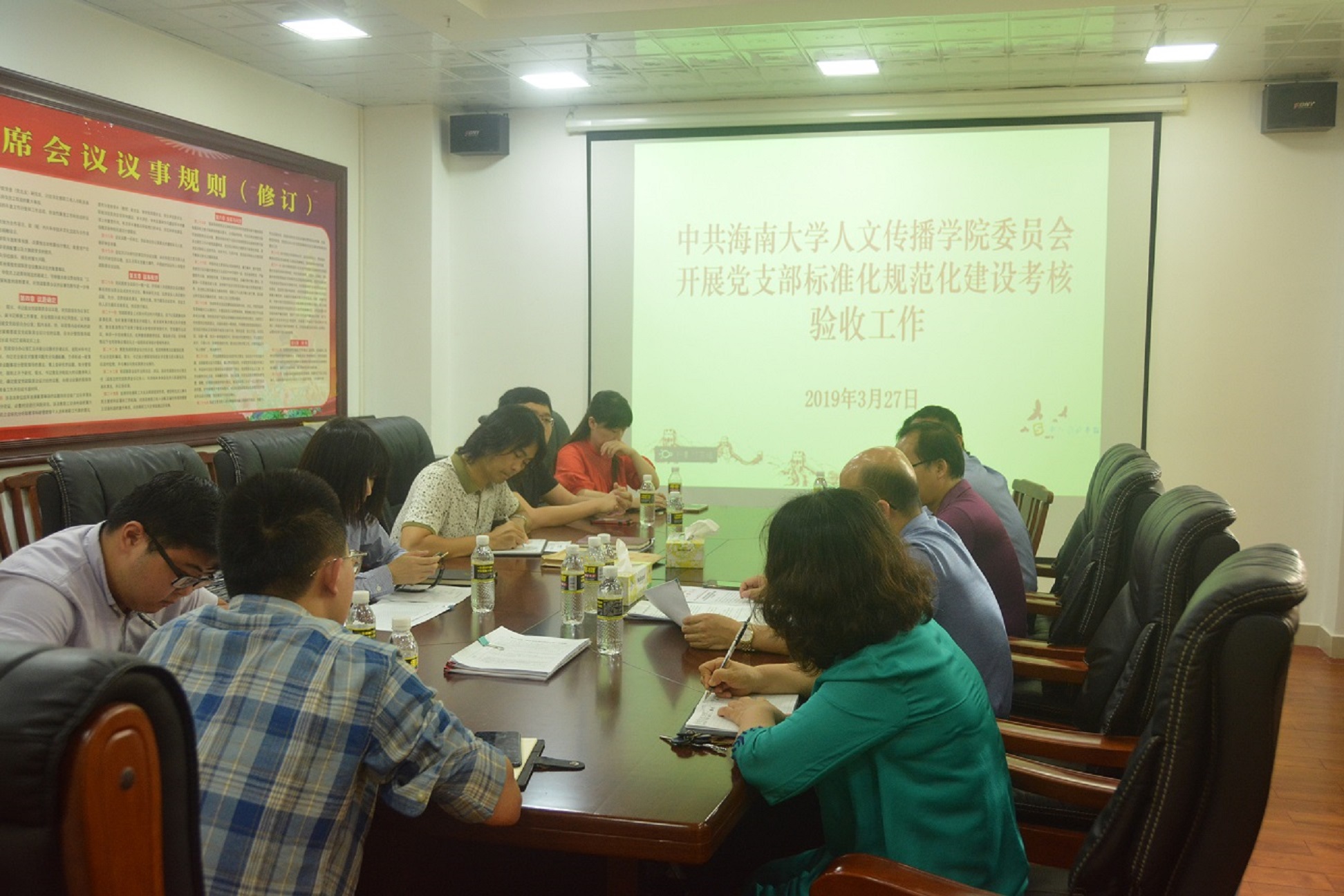 为进一步推进党支部规范化标准化建设,着力发挥党支部战斗堡垒作用,2019年3月27日上午,人文传播学院党委在社科楼B615会议室召开会议,开展党支部标准化规范化建设考核验收工作。会议由学院党委负责人邱华祥主持,党委副书记孙晓媛,党委委员公衍峰、王春嵩,全体党支部书记和党务工作联系人参加会议。会上,邱华祥同志传达了上级和学校关于党支部规范化标准化建设的精神,就考核验收提出工作要求。
