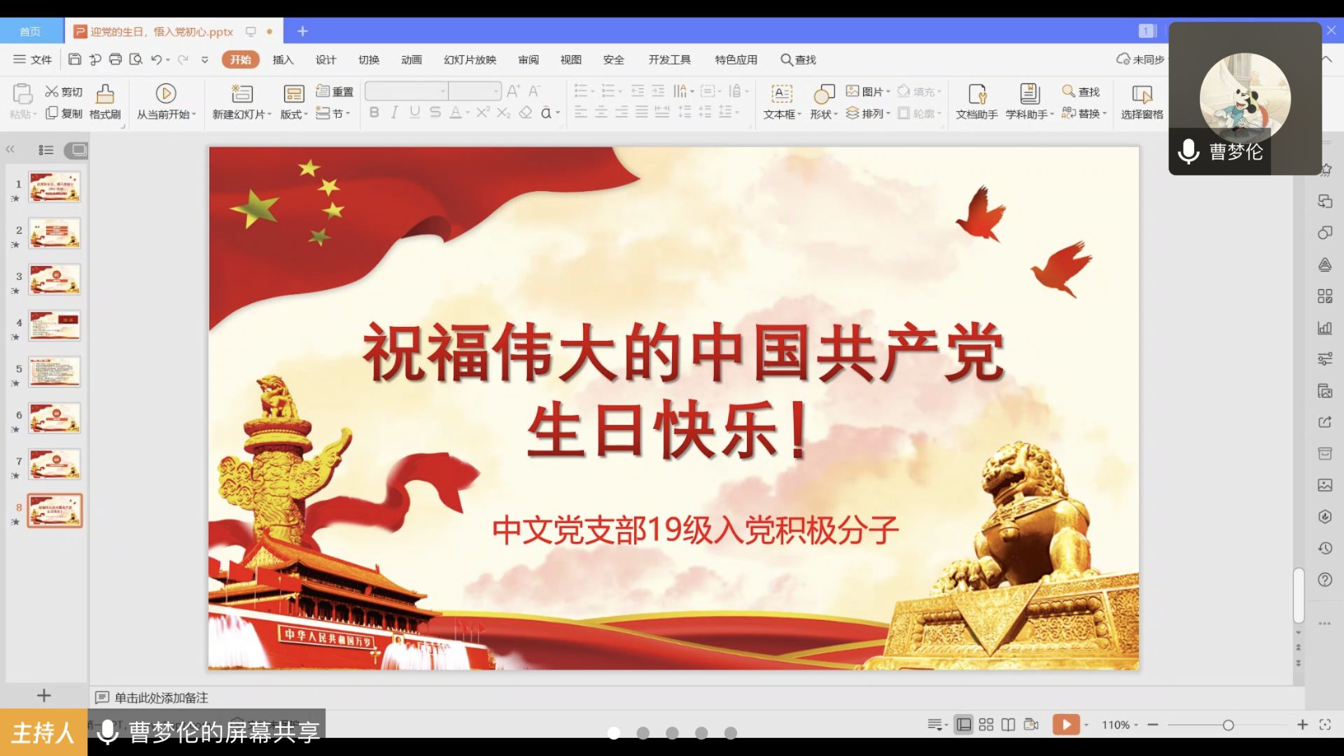 人文传播学院中文学生党支部于7月1日晚8点召开“庆党的生日,悟入党初心”线上学习交流会。会议由2019级入党积极分子曹梦伦主持,2019级全体入党积极分子参会。 会议第一项,重温党史。曹梦伦同志带领与会成员回顾了中国共产党99年来走过的风雨历程。与会成员通过回顾党史,加强了对党史的了解,增强党性观念、宗旨意识和责任意识。大家纷纷表示要坚定地高举党的旗帜,听党话、跟党走。