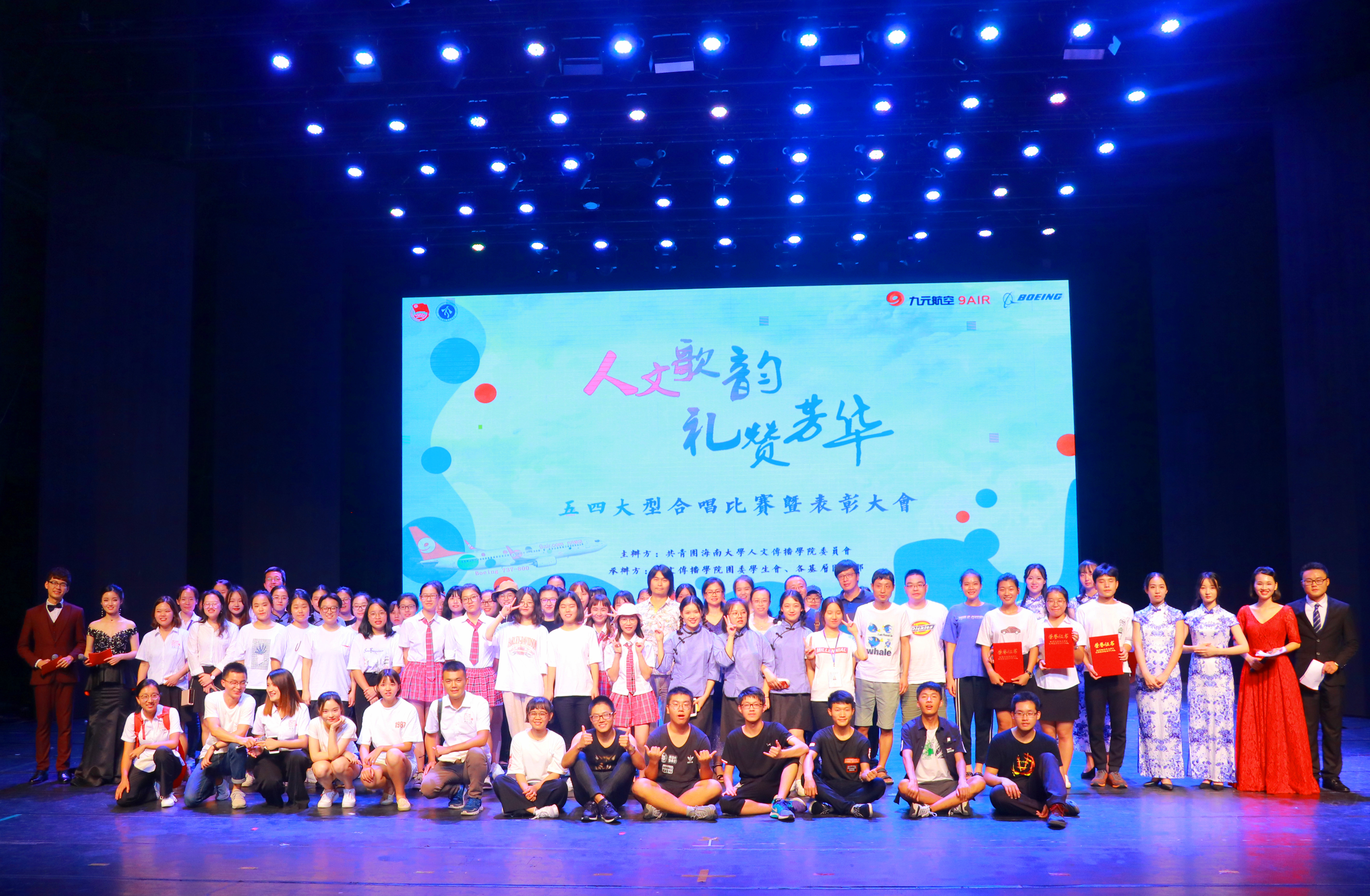 晚会正式开幕前,首先播放了人文传播学院团委一年以来的回顾总结视频,展示了人文团学风采。五四大型合唱比赛暨表彰大会在Air音乐社特邀嘉宾的歌曲表演中正式拉开帷幕。本次晚会由各年级各专业分别派出一支团队以合唱比赛的形式向观众呈现,由评委进行打分,最终评选出各参赛队伍的名次。整场晚会高潮迭起,互动不断,给在场的观众带来了一场精彩的视听盛宴。15级汉语国际教育带来的歌曲串烧《side to side》充分彰显了当代新青年大胆而自信的姿态;16戏剧影视文学专业的同学带来的朗诵与合唱《恰同学少年》,带我们回味了芳华少年;17级新闻传播学类同学的歌舞《不忘历史不负芳华》以旁白、舞台剧、合唱的形式,展现了不同时代的青春歌韵;中场由笑声工作坊的同学演绎的相声《绿色出行》号召我们践行绿色环保,在笑声中享受绿色生活;17级戏剧影视文学专业带来的合唱《上下五千年》,向我们展示了华服之美,再现康桥之上徐志摩的思念;最后,伴随着团学青成员带来的歌舞串烧《明日不害怕》,本次合唱比赛表演环节圆满结束。在评委们公平、公正的评分下,比赛结果也在大家的期待中公布。17级戏剧影视文学队伍以本场最高分获得比赛一等奖。17级中国语言文学类一、二班,17级新闻与传播类一、二班凭着优异的成绩获得二等奖,其他各专业表演团队收获三等奖和优秀奖。此外,通过“海大人文青年”微信平台进行的节目网络投票评选的“最具人气奖”由16级戏剧影视文学专业队伍获得。
