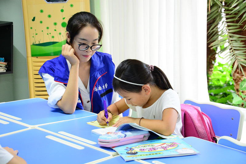 (海甸校区)北门集合,跟随青协带队人员前往世纪海岸社区。在等待孩子们到来期间,志愿者们主动帮忙整理读书角,为孩子们挑选适合的图书进行阅读。不久后,孩子们跟随家长陆续来到了社区书屋,主动与许久未见的志愿者们打招呼并分享了暑期生活的点滴。志愿者们也表示:“孩子们都长高了不少,也成熟了许多。”孩子们自觉地拿出了作业请志愿者们辅导,不时提出问题并与志愿者们一起探讨。作业完成后,志愿者们陪伴孩子们阅读童话故事,讲述书中有趣的情节,房间里充满着欢声笑语,志愿者们与孩子们共度了一个愉快的下午。