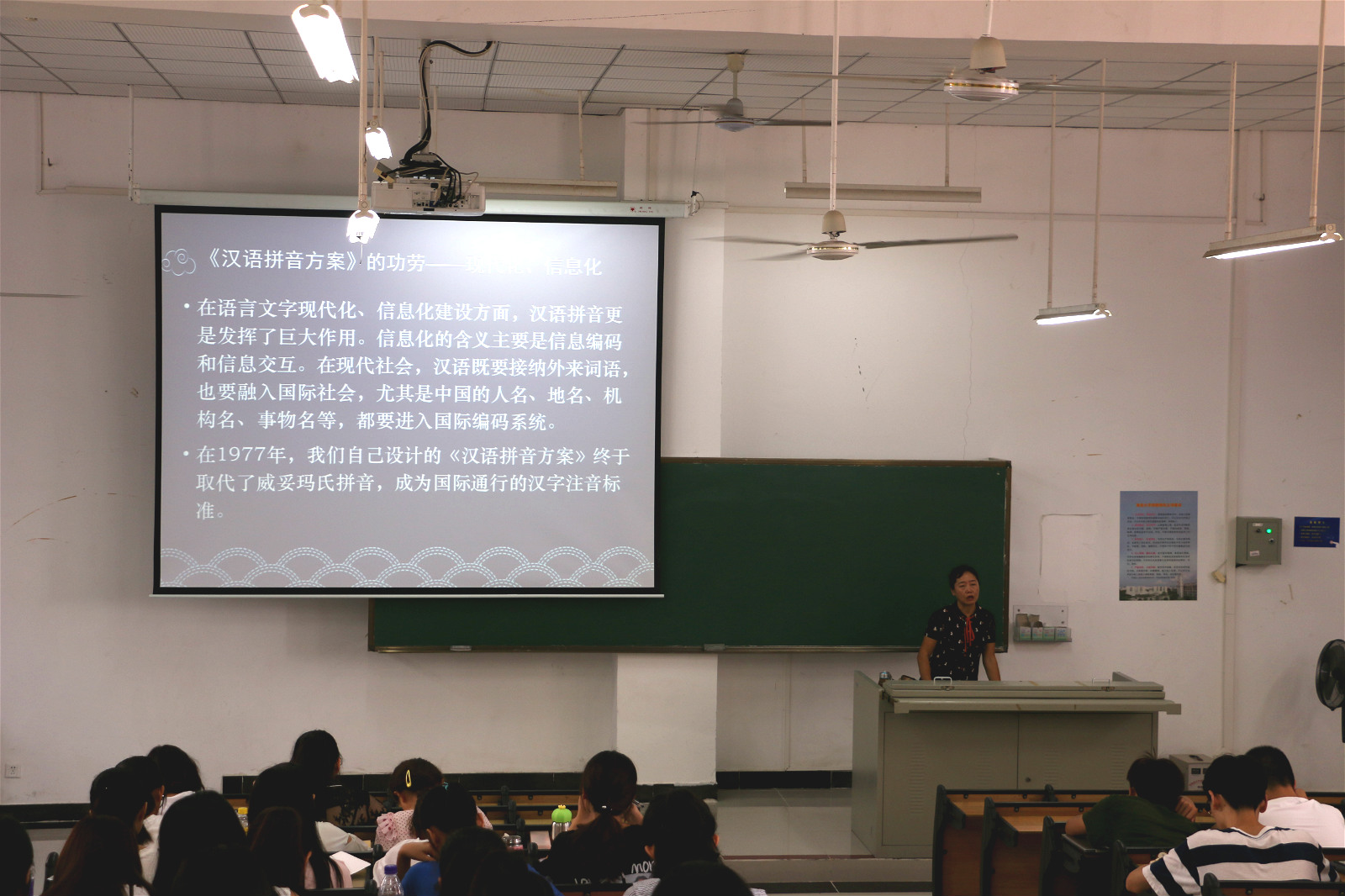 为深入宣传国家语言文字法规政策,大力推广普通话,优化学校语言文字环境,根据《教育部等九部门关于开展第21届全国推广普通话宣传周活动的通知》(教语用函[2018]3号)和《海南省教育厅转发教育部等九部门关于开展第21届全国推广普通话宣传周的活动通知》(琼教语[2018]33号)的精神,按照党委宣传部的安排,人文传播学院组织中文专业160多名学生,于9月11日下午,在5教114开展“讲好普通话,迈进新时代”普通话宣传推广讲座。此次活动邀请了中文专业黄松梅老师作主讲人,讲授汉语普通话和文字的规范使用。