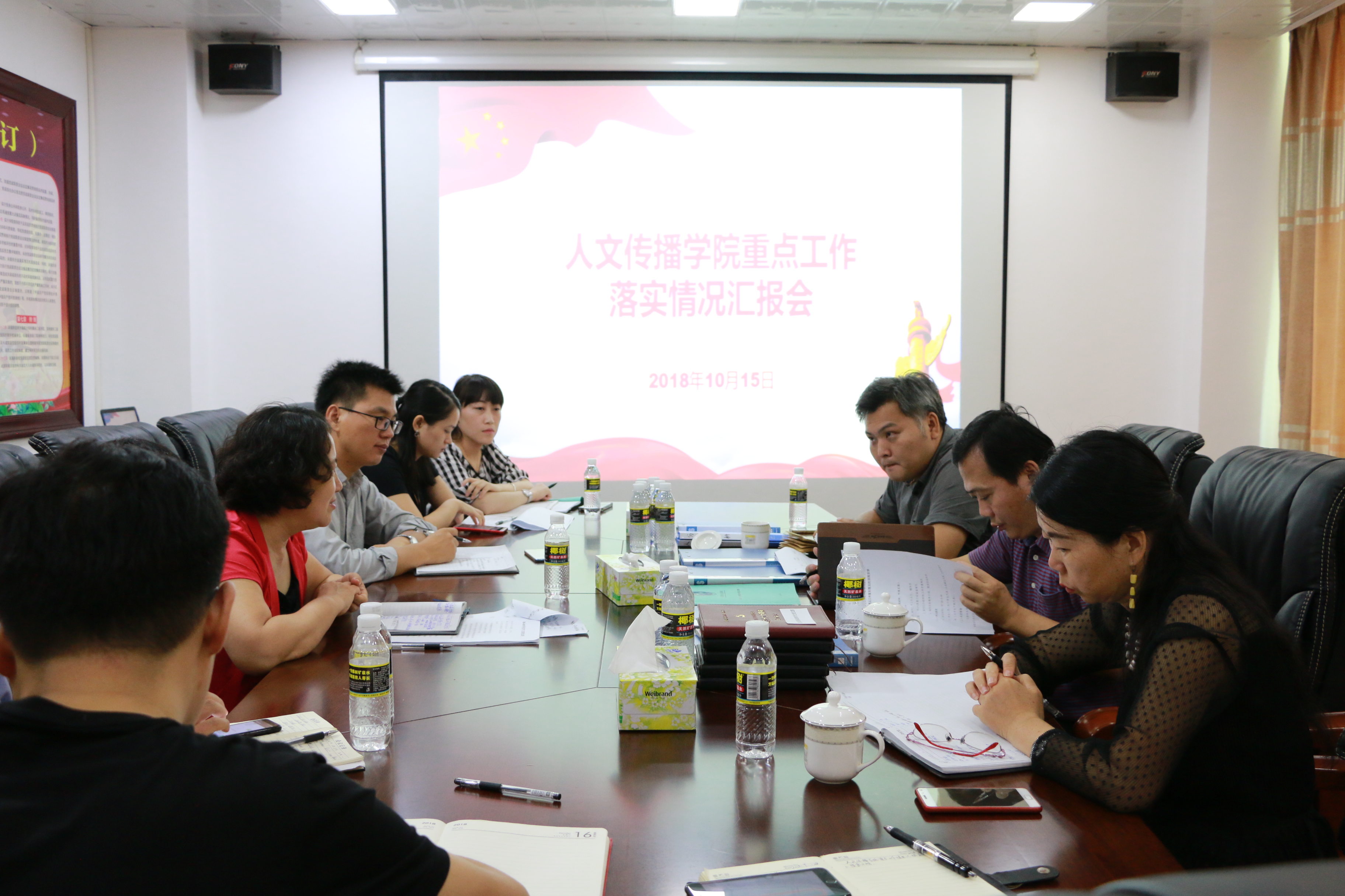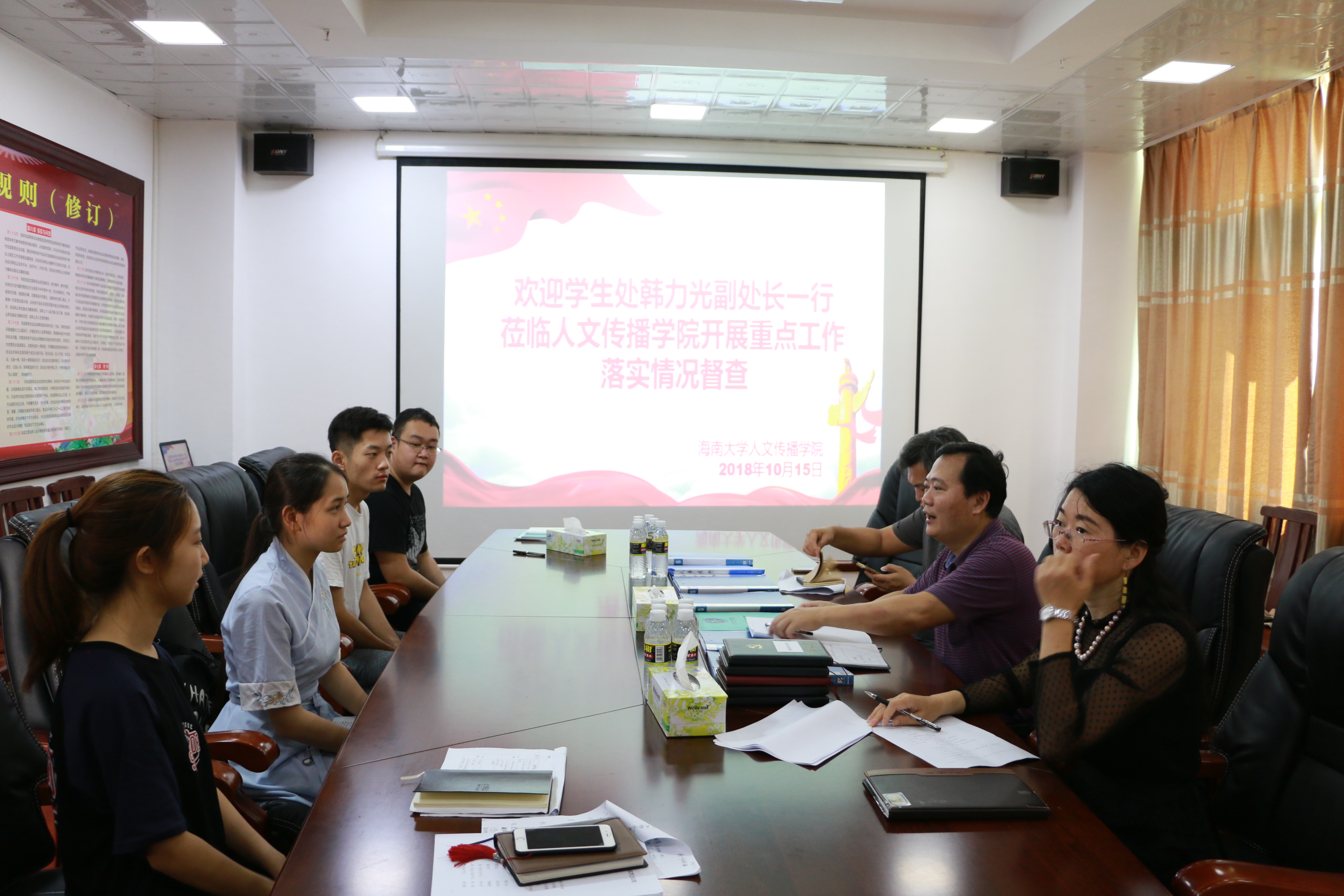 为进一步加强学生工作的过程管理,推进学院学生工作的标准化、规范化建设,提升学生工作的效率和质量,2018年10月15日上午,人文传播学院学生工作重点项目落实情况汇报会于海甸校区社科楼B615会议室顺利召开。学生工作处(部)督查组成员学生工作处(部)副处(部)长韩力光,心理健康教育中心主任吴九君,学生助学贷款与资助科主任黄良颖,学院党委副书记孙晓媛及全体学生辅导员出席本次汇报会。会议由学生工作处(部)副处(部)长韩力光主持。