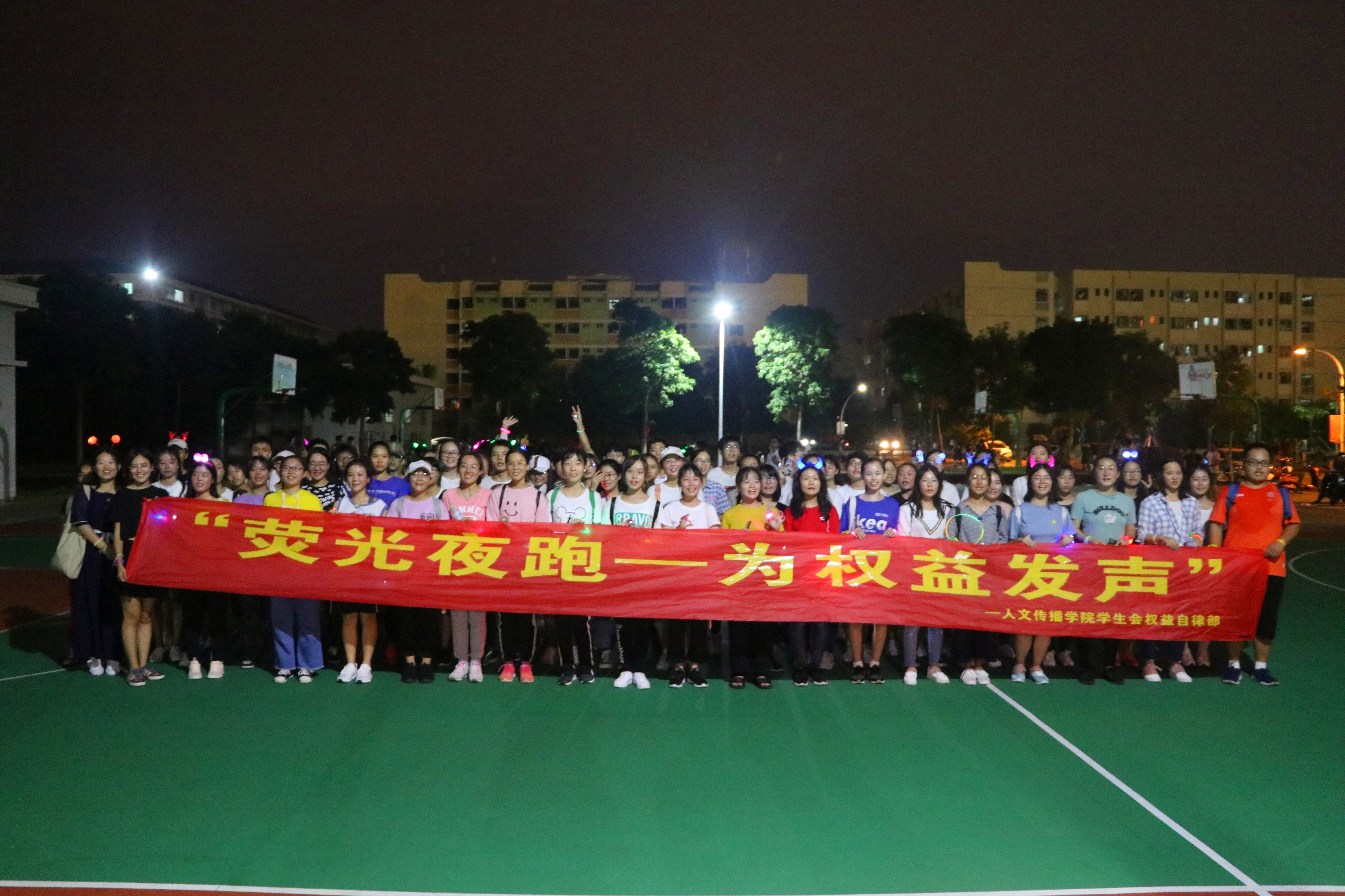 为进一步增强广大人文学子的维权意识,提高对权益知识的了解度,2018年10月27日晚,人文传播学院“荧光夜跑,为权益发声”的主题荧光夜跑活动于海甸校区灯光球场顺利开展。人文传播学院学生会主席团及部分兄弟学院学生会负责人出席此次活动。学院17级、18级90余名学生代表,部分学生会工作人员参加活动。此次活动由学院学生会权益自律部具体承办,学生会体育部协办。