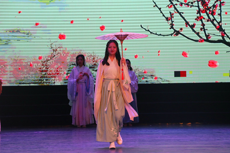 在第三篇章“解忧云水谣”中, 17级中文四班的同学们身着汉服带来群舞《破晓》,舞者们尽态极妍,舞出人文院的厚重底蕴;笑声工作坊带来的喜剧《因为你是女侠》,幽默的剧情与演员们极具感染力的表演让观众们捧腹大笑,深刻的主题又让观众们在笑后有所思考。备受期待的走秀《青芷芳华》创新性地加入汉服元素,精彩的走秀表演,惊艳四座,尖叫欢呼声此起彼伏;晚会尾声,由团学青成员们带来舞蹈《飞过时间的海》,欢快的歌声,整齐的舞步,彰显了团学青强大的凝聚力,会场的氛围被推向高峰,在不绝的欢呼声与掌声中,人文传播学院“南渡·少年游”迎新文艺晚会圆满落幕。