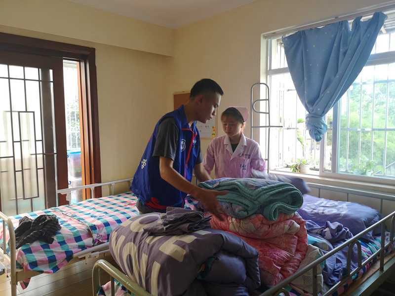 志愿者帮忙收拾床铺