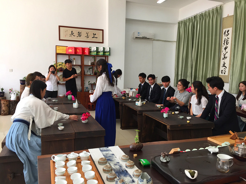 国学社社员向早稻田大学的同学展示了中国茶艺,海大学子与早稻田大学学生围绕中日文化交流、海外学习实践、大学生就业、社团文化等话题展开深入交流,感受异国文化意趣。在国学社社员的指导下,几位日本友人还愉快的体验了一下中国茶艺。