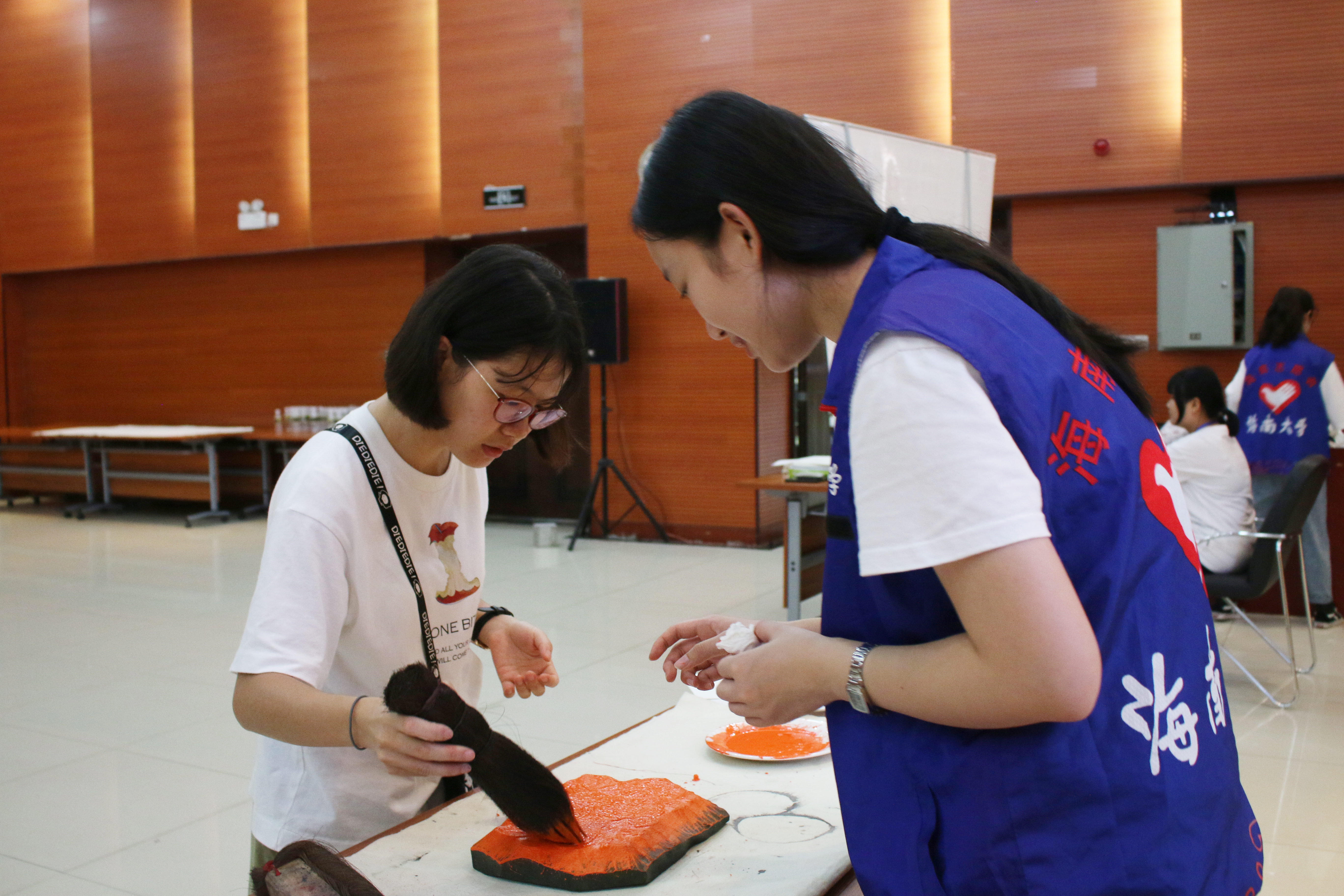 在雕版印刷体验区,经由志愿者和工作人员的演示,同学们可在三块朱仙镇年画雕版任选其一进行印刷,体验雕版印刷技术的精妙之处。由于雕版印刷对技巧和熟练程度要求较高,墨汁的浓淡、刷墨所用时间、鬃刷扫过纸面的时间和力度都会影响作品的质量,不少前来体验的同学都表示这项已被正式列入国家级非物质文化遗产保护名录的技艺的确不容易掌控。在志愿者的鼓励下,同学们多次尝试,掌握方法后都印出了满意的作品。
