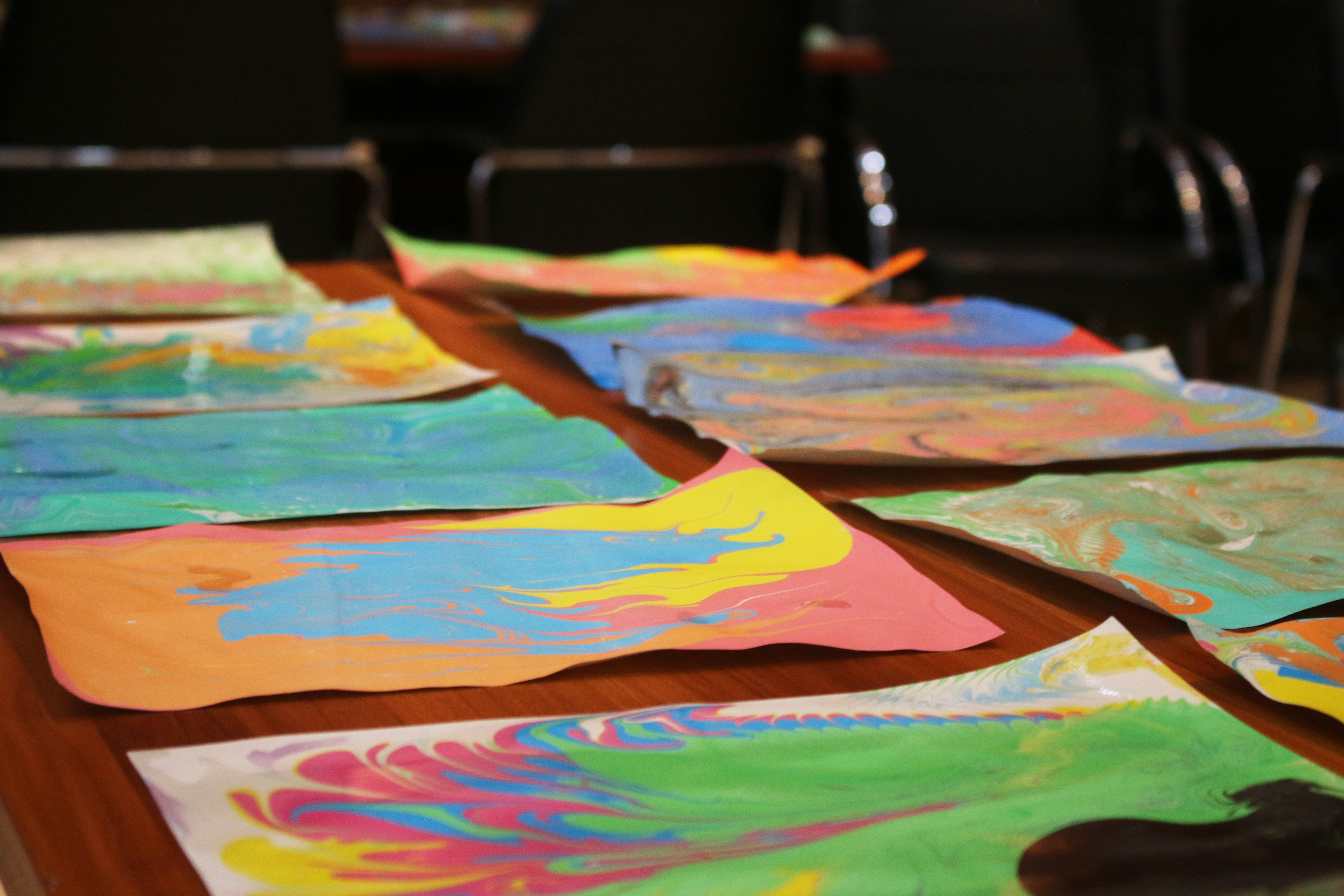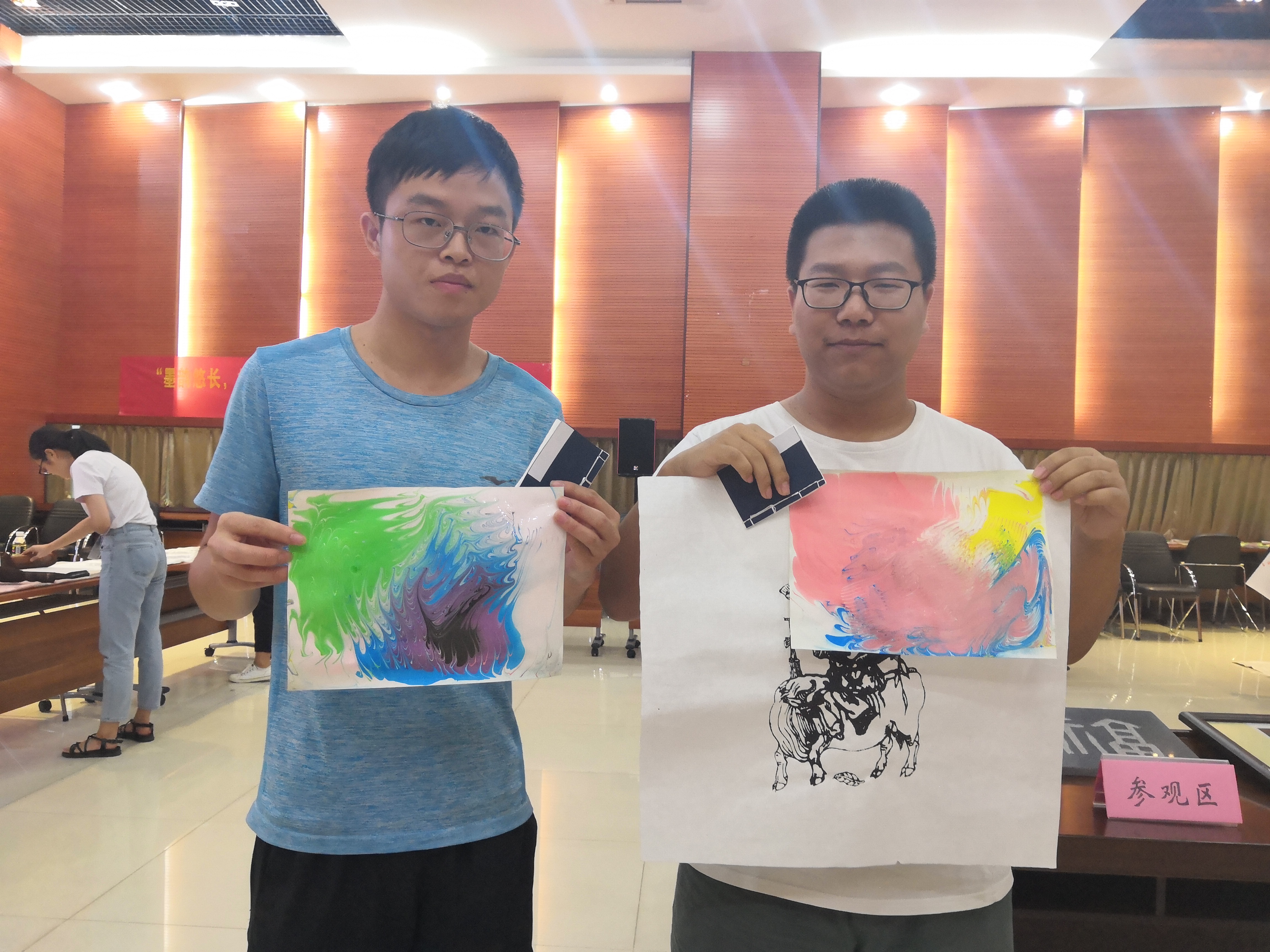 在水拓画体验区,用于展览的水拓画成品整齐地摆放在桌上,同学们被美丽的花纹所吸引后跃跃欲试,仔细询问志愿者改如何操作及注意事项。在志愿者的指导下,同学们自由选择各色颜料进行创作,在卡拉胶溶液表面拨出花纹,轻铺纸张于水面,再次拈起时,已变成一幅幅独具匠心的艺术作品。一些同学专注于制作水拓画,称:“希望多做几张风干后带给朋友作为纪念。”
