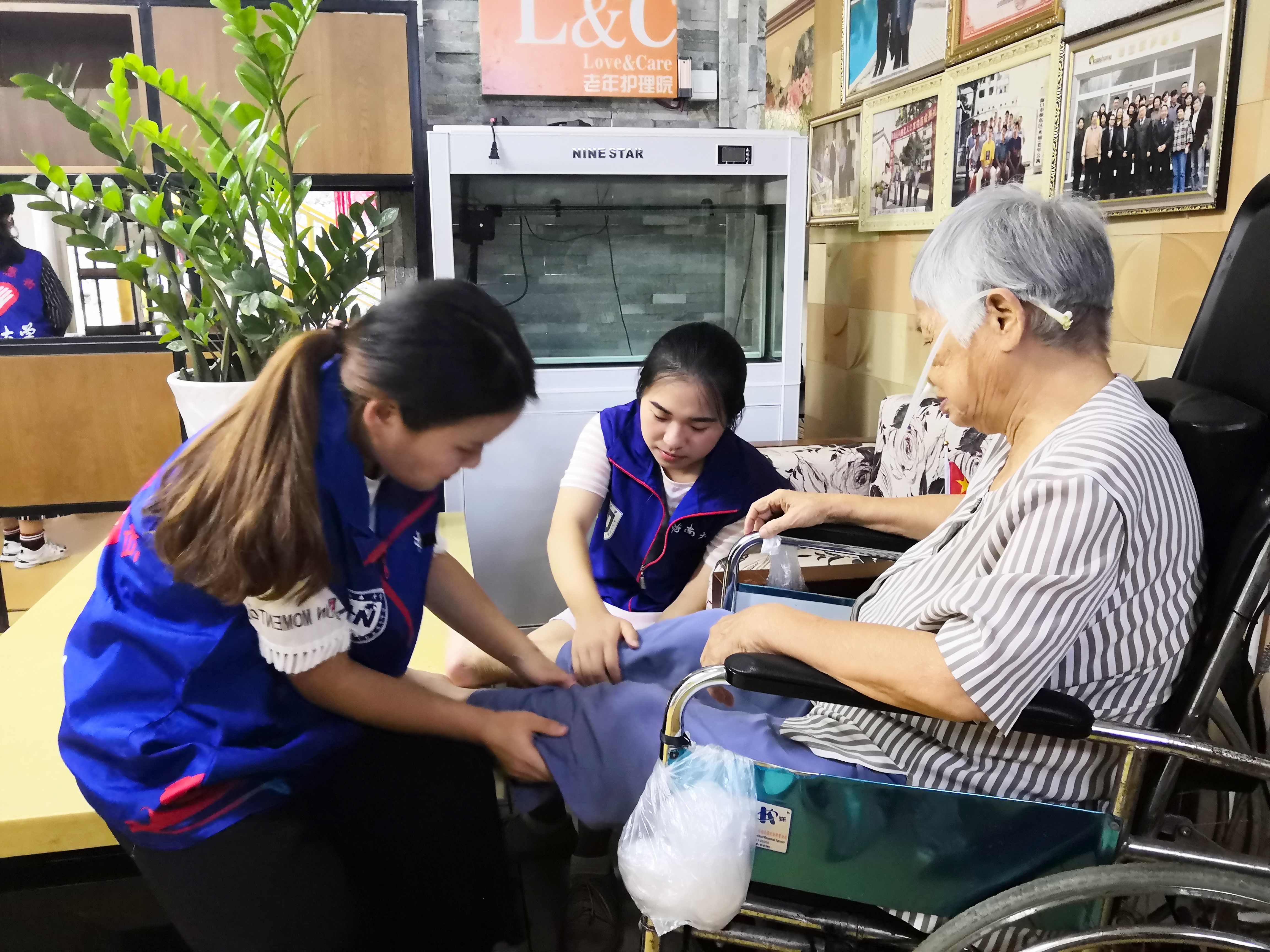 城西校区西北门集合,在带队人员分发志愿者服和饮用水后,统一乘车前往活动地点。到达老年公寓,在医护人员说明注意事项后,志愿者们以小组的形式前往各个楼层开展志愿活动。志愿者们帮助医护人员打扫卫生,为老人们揉肩捶腿,有的志愿者们更是为老人们唱起了歌,飘扬的歌声,使老人们陷入美好的回忆中,整个房间都充满了欢声笑语。