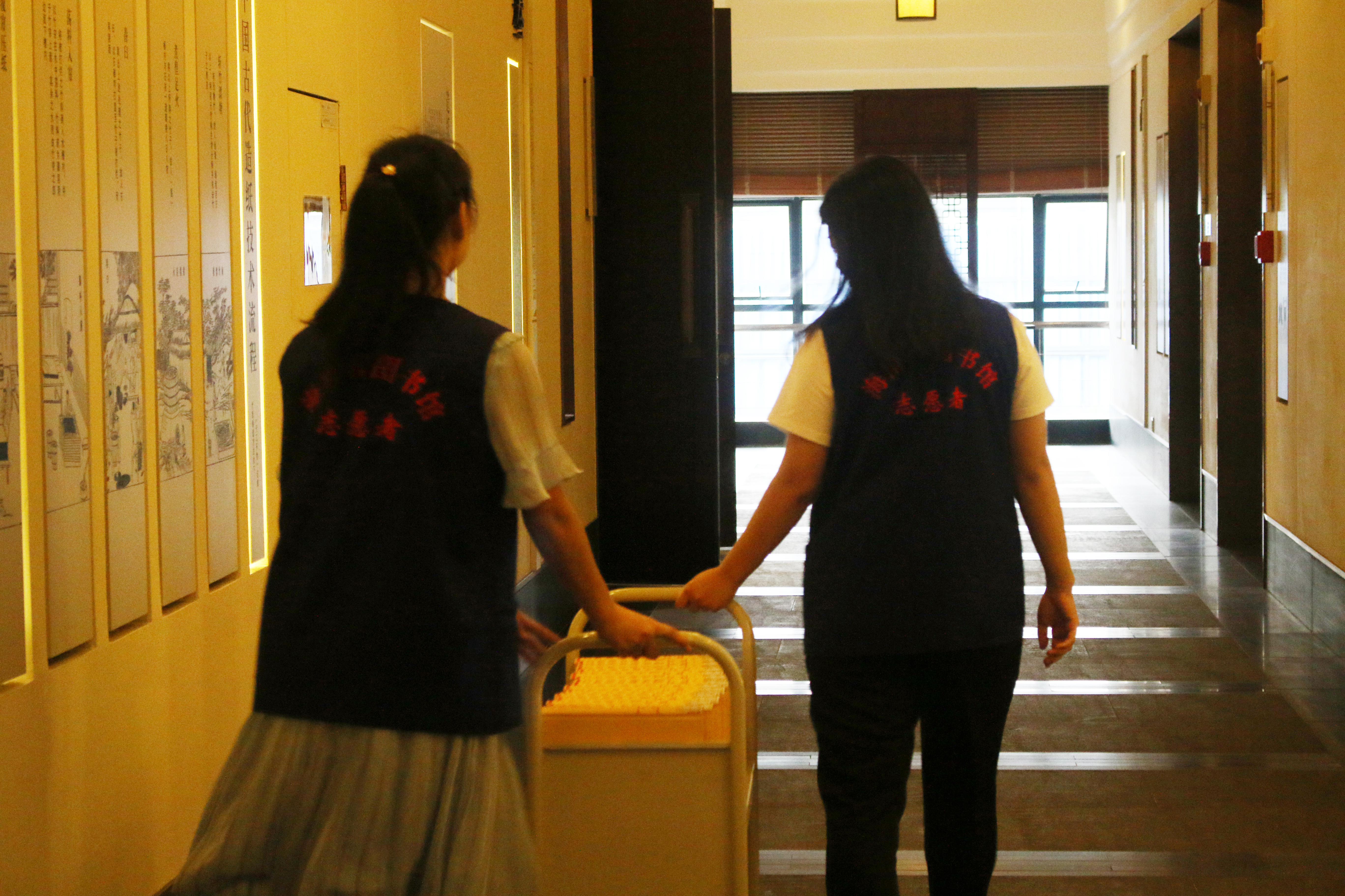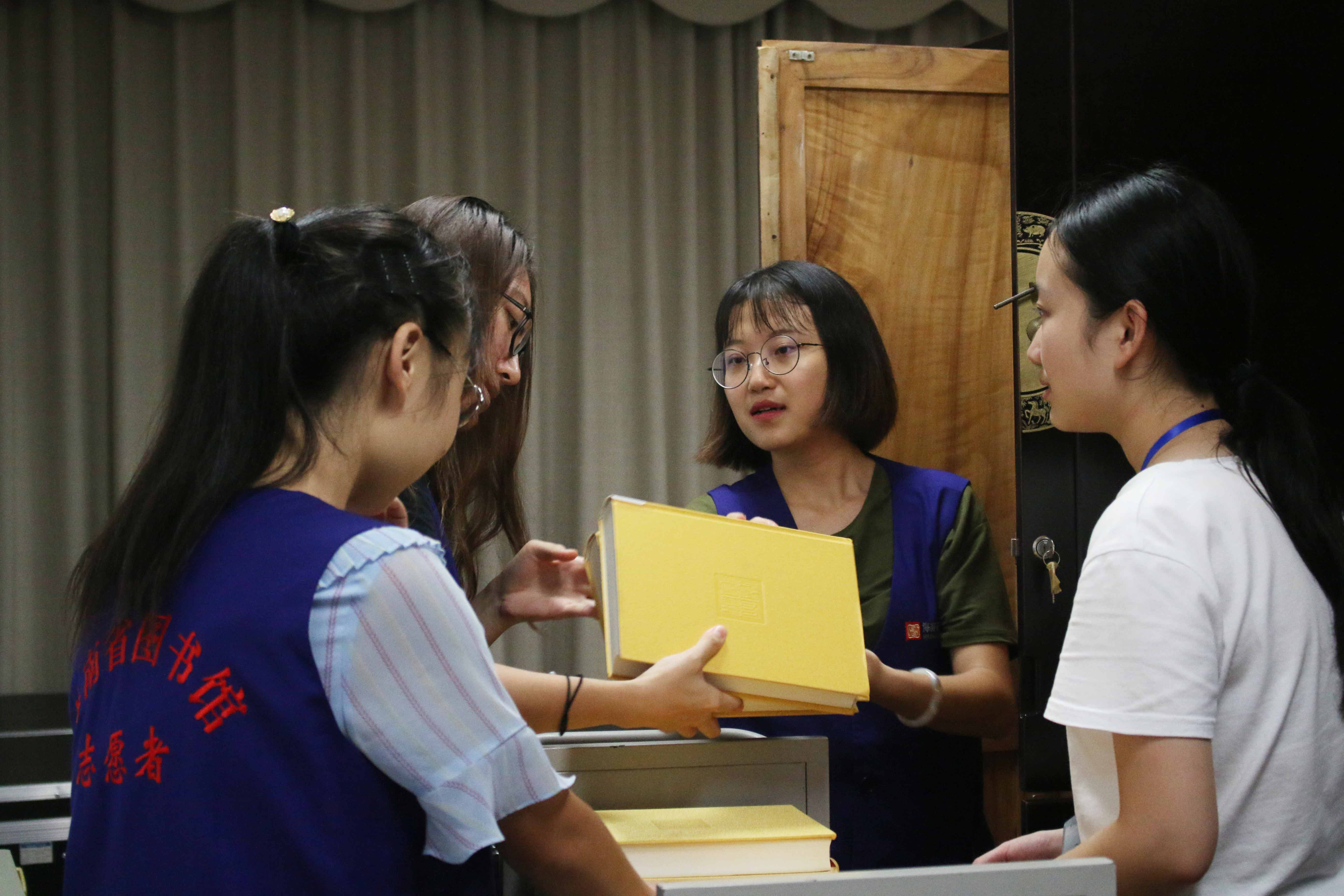 恰逢古籍保护中心整理古籍善本重新上架,在工作人员的安排下,志愿者们清理、擦拭书架,将古籍阅览室内的《钦定四库全书》等书籍登记、下架并整理入库,替之以全套1500余本《文津阁四库全书》。从古籍特藏室到古籍阅览室,卷帙浩繁的古书间到处都有志愿者们忙碌的身影。志愿者们从古籍特藏室中转移出古籍善本,按编号整理上架,以便日后读者借阅。志愿者们有序分工,高效地完成了工作。