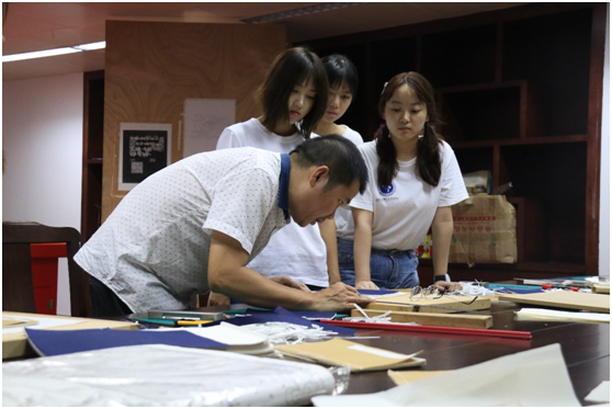 雕版印刷作为国家非物质文化遗产,主要工具有雕刻模板、棕刷和印刷,主要步骤为:首先是用雕版印刷工具棕刷上墨,然后匀墨,将宣纸铺在上面,用印刷轻刷宣纸,直到墨汁均匀印刻与宣纸之上,最后起纸,一幅精美的图画便跃然于纸上。实践队员观看黄老师演示教学之后,纷纷动手亲自实践起来,完成多幅拓印作品,体会到了传统印刷术的神奇,感叹中国四大发明之一的印刷术的伟大。