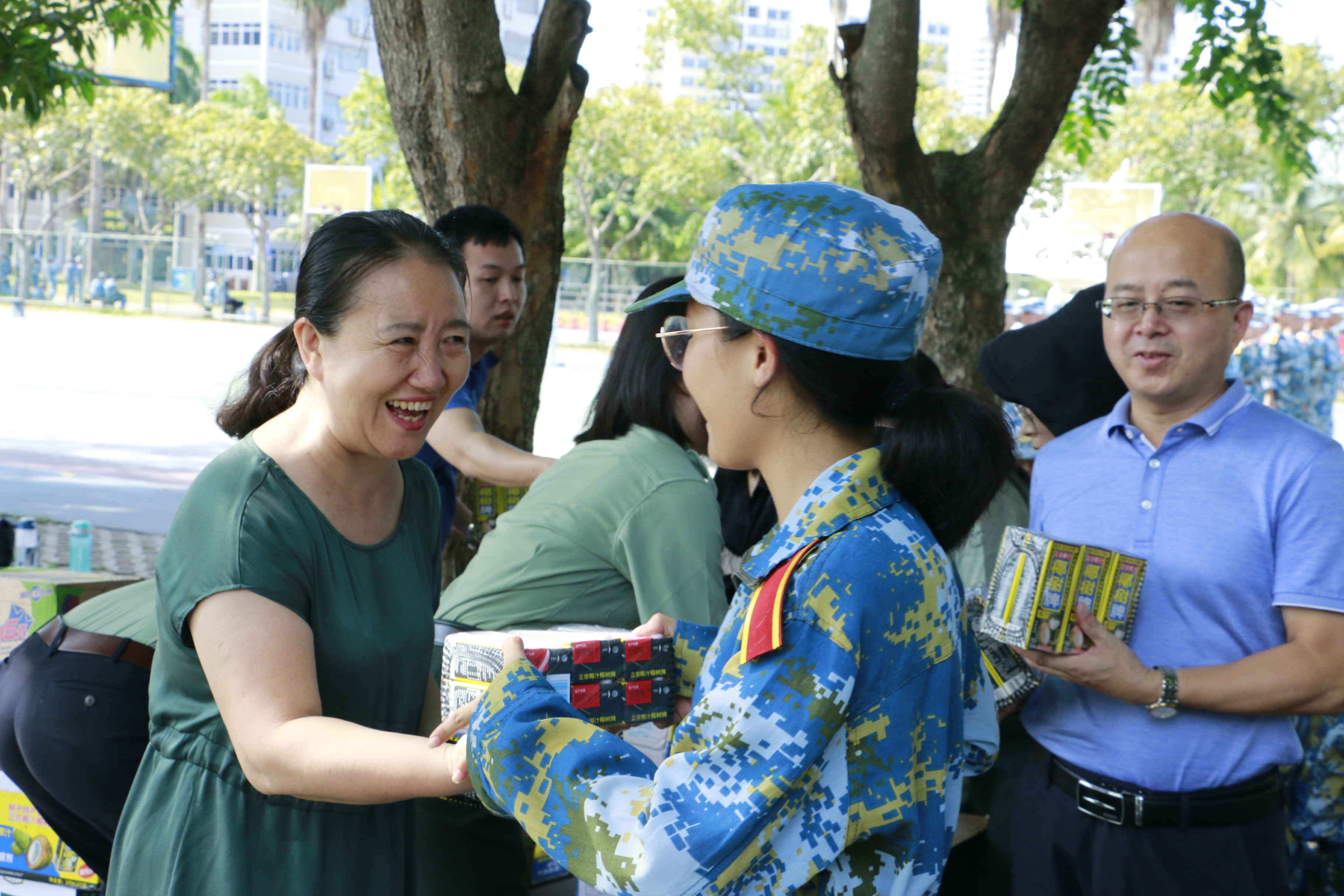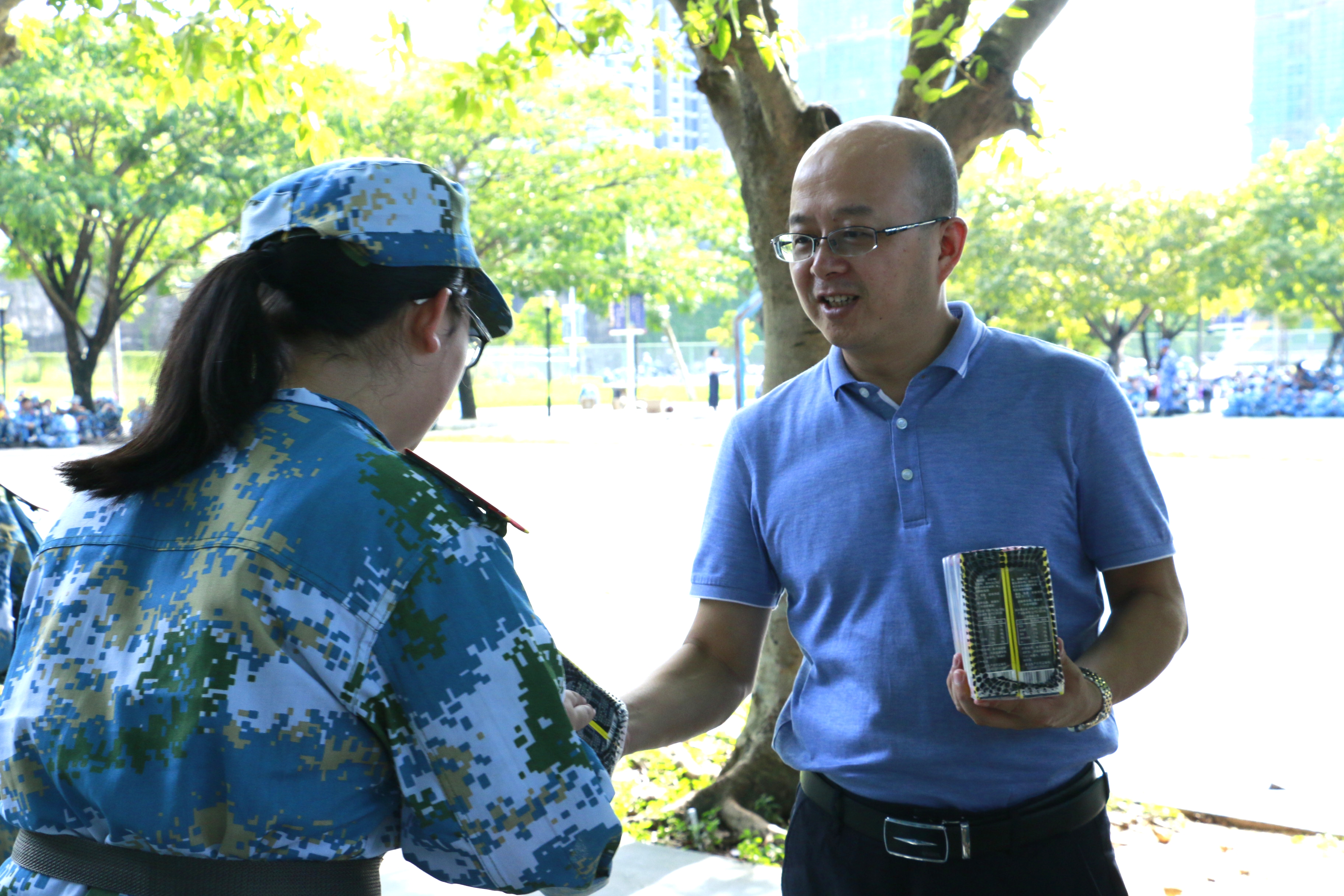 走进军训场地,看着正在烈日下训练的新生,邱华祥不时向教官和辅导员询问训练情况,主动热情地与每位教官握手、交谈。在发放慰问品环节,邱华祥和孙晓媛将学院准备的慰问品亲手发放给每一位同学,因病没有到场的同学,还亲切的叮嘱其他同学帮忙带回去。