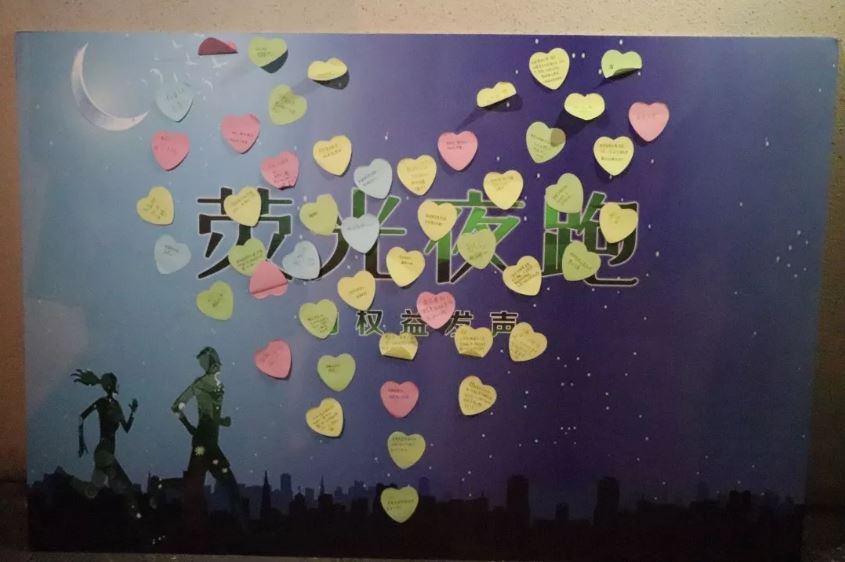 活动正式开始前,人文传播学院体育部首先为“就这young跑”的获胜者颁发了奖品,以鼓励广大同学参与到每天的体育锻炼当中。在主持人介绍到场嘉宾后,“荧光夜跑——为权益发声”活动正式开始。开跑前,工作人员为每个到场的同学们发放了心形的便利贴和签字笔,让他们写下自己在学校生活中遇到的权益问题并贴于权益心愿板上,使权益部通过此次活动更好了解同学们的权益诉求。