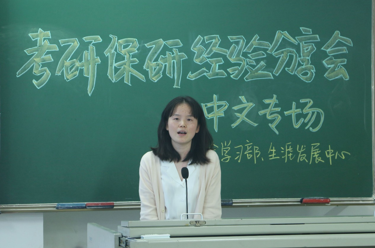 第一个上台做经验分享的是推免至湖南大学语文教育专业的尚益名学姐。学姐说,保研最主要的是要注重平时绩点,其次是多参加比赛,最好获得奖项,为自己增加优势。学姐还强调了论文对于保研的重要性。学姐还为在座的学子当前的学习提建议,在上课时注重平时分,上课积极回答问题,留意老师推荐的书目,在考试前要学会向学长学姐咨询考试的注意事项等等。