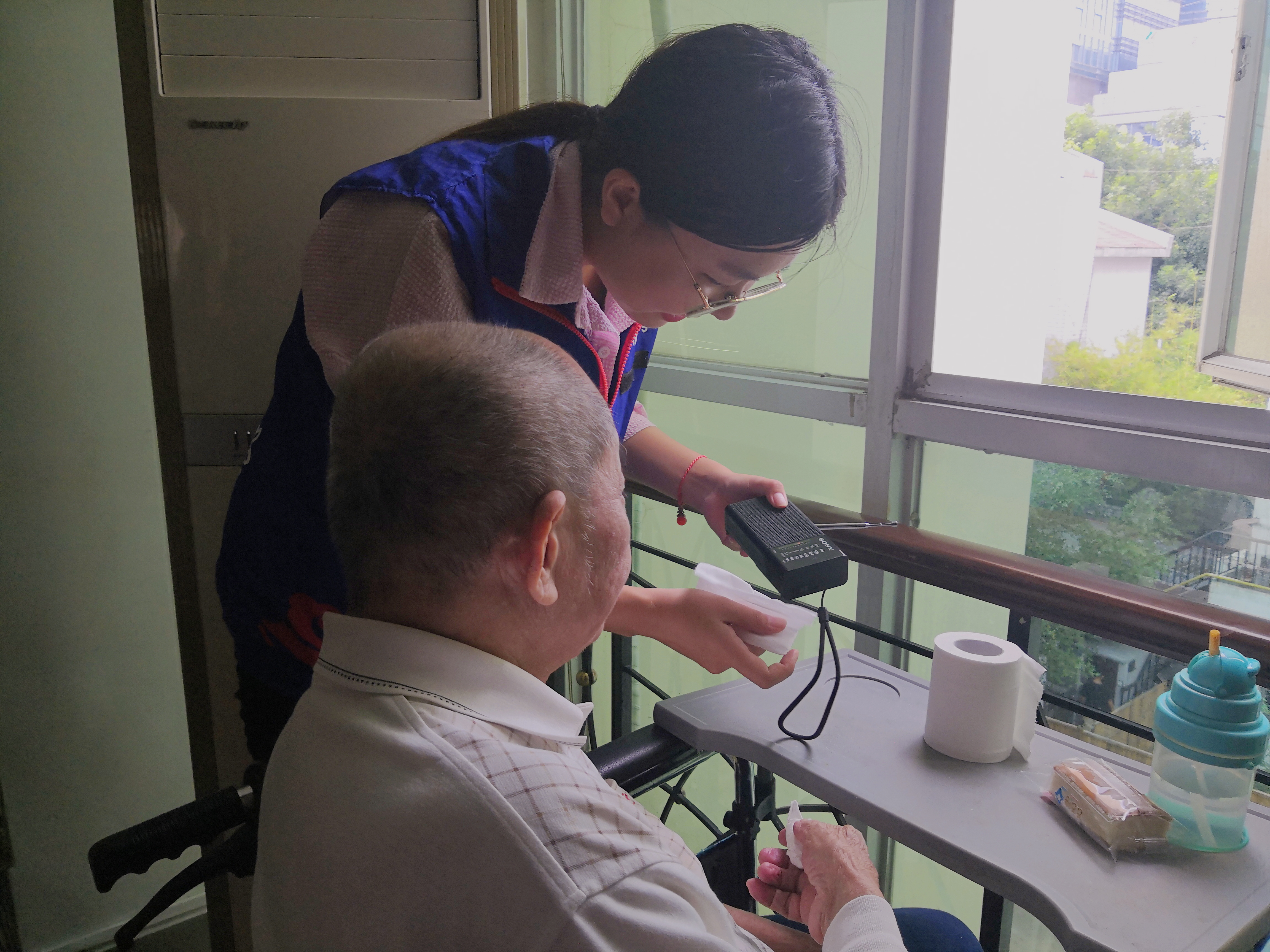 志愿者给老人调收音机