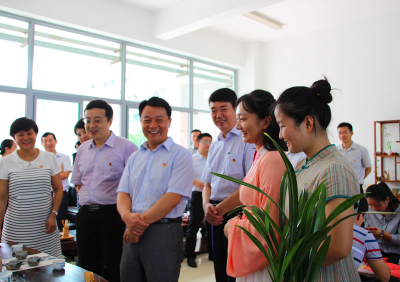 国学社,国学社内窗明几净,茶艺组社员现场为傅振邦书记一行展示了茶的冲泡过程,并按“以茶表敬意”的传统礼节向傅振邦书记一行客人奉上新泡制的香茗。傅振邦书记一行在国学社内还观看了由社团同学带来的古筝与箫的合奏表演、书法展示以及传统手工剪纸活动。观看期间,国学社社长张君怡同学向傅振邦书记一行详细介绍了社团建设及发展情况,傅振邦书记也十分关心国学社发展现状并详细询问社团情况,对国学社弘扬中华民族优秀传统文化,践行社会主义核心价值观的社团宗旨表示赞扬。