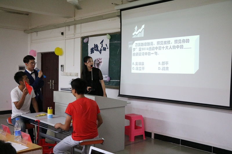 城西校区6c01教室拉开了帷幕。人文传播学院学工办王俊延老师、团委副书记刘昱竹同学作为嘉宾出席了本次活动。 下午3:00,主持人以人文韵味的开场白拉开了本次比赛的序幕。本次活动,共计“小试牛刀(初赛)”、“才高八斗(复赛)”和“一决高下(决赛)”三个环节。在“才高八斗(复赛)”环节中,通过通过抽签匹配的选手分别就“文学、文娱、体育、理化、社会、生活趣味、自然科技”七组分类题目展开激烈对决。在中场游戏加分环节中,选手们也展现出了他们的积极性和随机应变的能力。在“一决高下(决赛)”环节中,选手分别就“古、今、中、外、闻天下”五个关键词对应的题目展开竞答。 比赛过程中,选手们努力开动思维,展现自己的知识储量,许多趣味题也引得同学门爆发阵阵笑声,整个现场氛围轻松愉快。同时,选手们秉承着友谊第一,比赛第二的宗旨。在一番精彩角逐后,常璐同学夺得桂冠,郭瑞鹏和李佳岭分别取得亚军和季军,张馨之和王玥获得优秀奖。随着颁奖典礼的结束,本次活动也圆满落下了帷幕。 本次活动不仅学习贯彻了党的十八届四中全会精神,还弘扬了以“二十四字方针”为基本内容的社会主义核心价值观。在活动中培养同学之间的团结精神与竞争意识,营造文明、健康、活泼的校园氛围与学习环境。新闻部 田紫沁