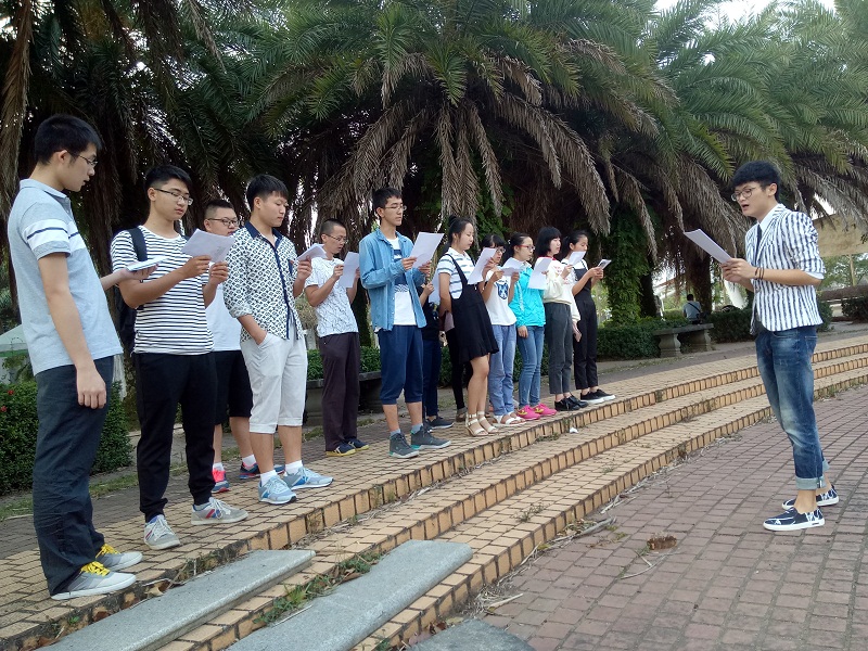 城西校区神农园顺利举行。人文传播学院2016级全体学子积极响应,外国语学院部分学生和学工办王俊延老师作为嘉宾参加了此次活动。 活动开始后,参加活动的同学们根据自己的兴趣爱好进行组队,共分为四个小队:英语口语队,日语口语队,诗歌队,散文队。经过40分钟的嘉宾领读和自由朗读,同学们以小组为单位进行成果展示。小组展示过程中,英语口语队字一声声正腔圆的交际用语让其他队的同学们刮目相看;紧接着,日语口语队的同学也用一首日文歌曲惊艳了全场;作为中文特色的诗歌队和散文队也不甘落后,用优美的词句征服全场。在活动的结尾,学工办王俊延对此次活动进行了点评,肯定了同学们的精彩表现,也对同学们提出自己的期望。 本次活动在轻松愉悦的环境中圆满落幕。一日之计在于晨,此次活动的圆满解决不仅使同学们增长了知识,也有利于更多的同学养成良好的学习习惯和作息习惯。