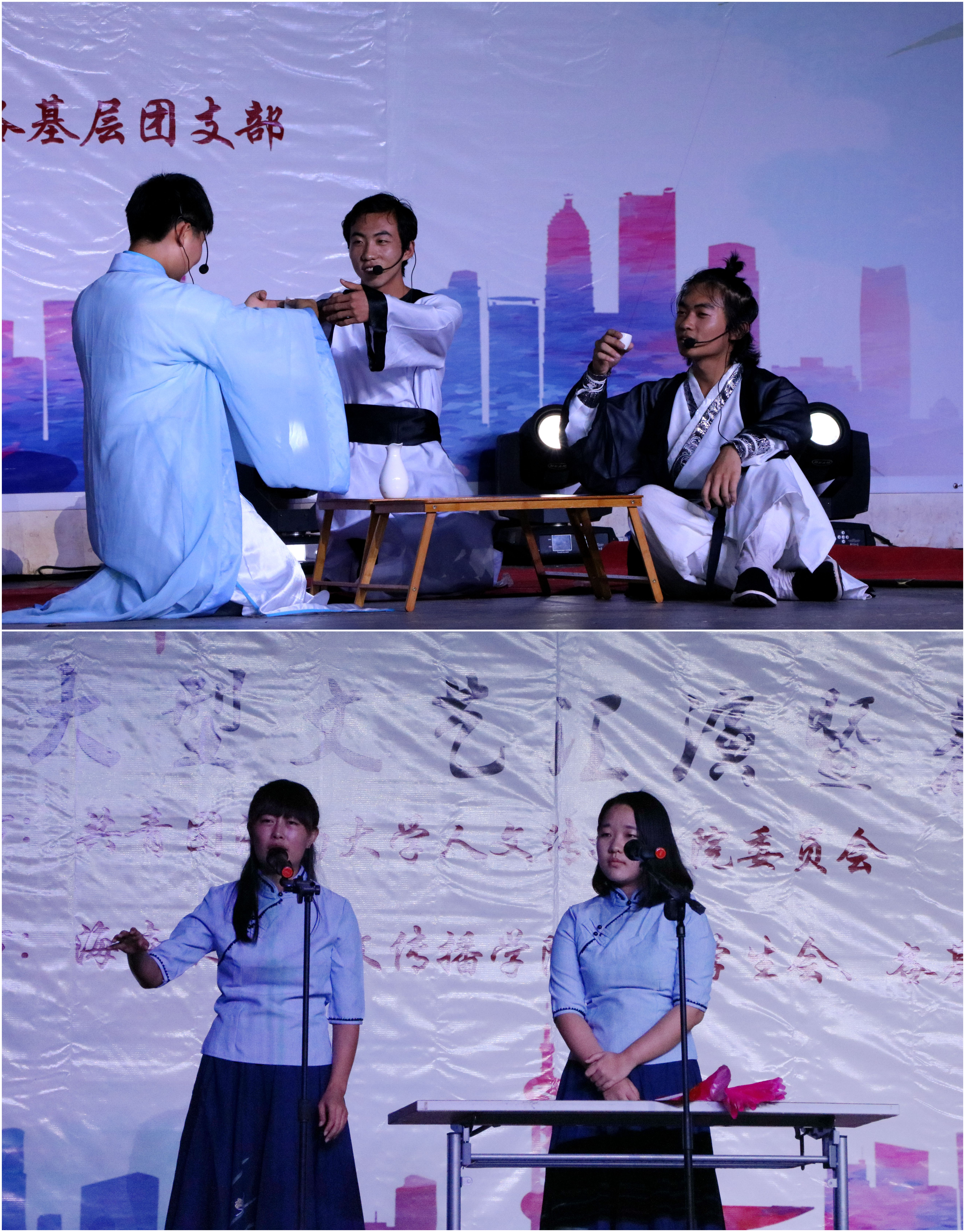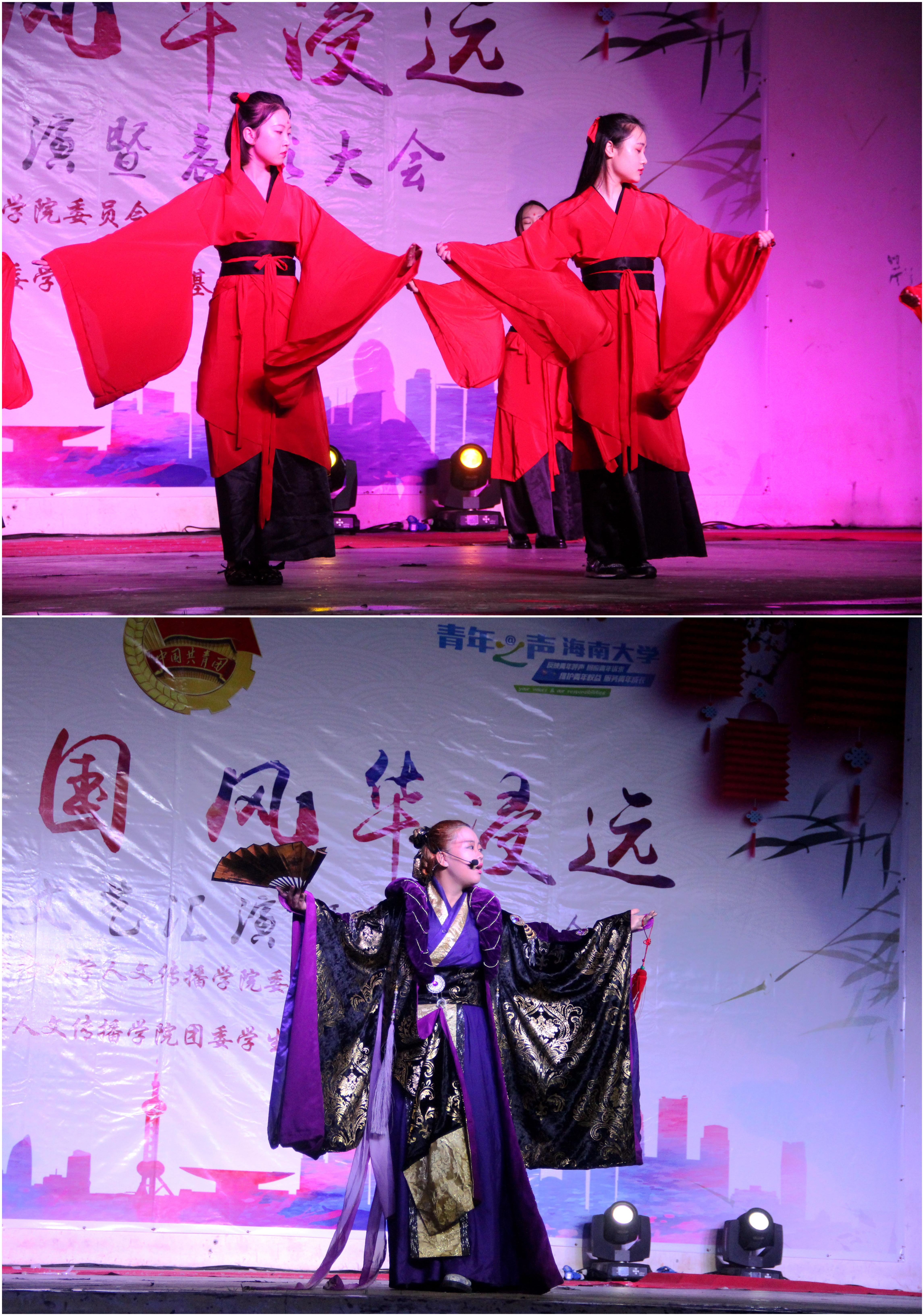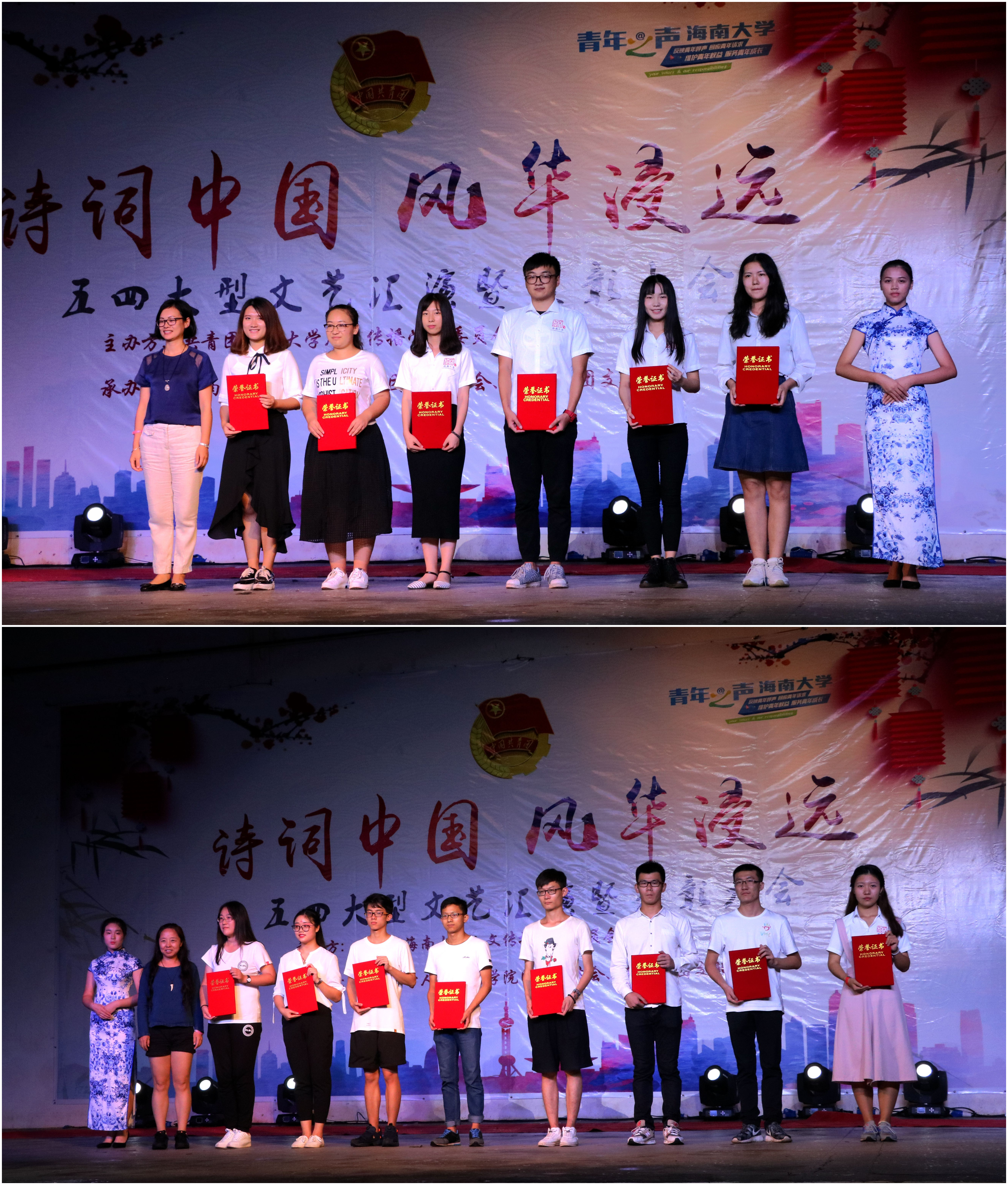 20点整,五四文艺汇演暨表彰大会在国学社以及特邀嘉宾的歌舞串烧的表演中正式拉开帷幕。本次文艺汇演由各年级各专业分别派出一支团队以比赛的形式向观众呈现,由评委进行打分,最终评选出各参赛班级的名次。晚会中,诗与歌舞的巧妙结合,向大家展现了中国诗词的魅力。15级汉语国际教育的同学表演的舞蹈《茉莉花》以整齐的阵容、优美的舞姿引起现场掌声连连。14级汉语国际教育的同学演绎的相声《学富五车》触发了全场的笑点,将古今中外的寓言故事环环相扣,现场欢笑不断。16级中国语言文学类三、四班同学带来的《将进酒》活灵活现的还原了李白、丹丘生、岑夫子三人饮酒作诗的情景,将李白的豪放与浪漫表现得淋漓尽致。16级戏剧影视文学的同学表演的《但愿人长久》将古筝、舞蹈、歌曲、朗诵串烧,碰撞出不一样的花火。最后,伴随着团学青成员带来的歌舞兼朗诵《荡起我们的中国心》,本次文艺汇演表演环节圆满结束。在评委们公平、公正的评分下,比赛结果也在大家的期待中公布。16级中国语言文学类三、四班以本场最高分获得本次汇演一等奖。16级戏剧影视文学、16级新闻传播、15级汉语国际教育凭着优异的成绩获得二等奖,其他各专业表演团队收获三等奖。此外,通过“海大人文青年”平台进行的节目网络投票评选的“最具人气奖”由16级戏剧影视文学获得。