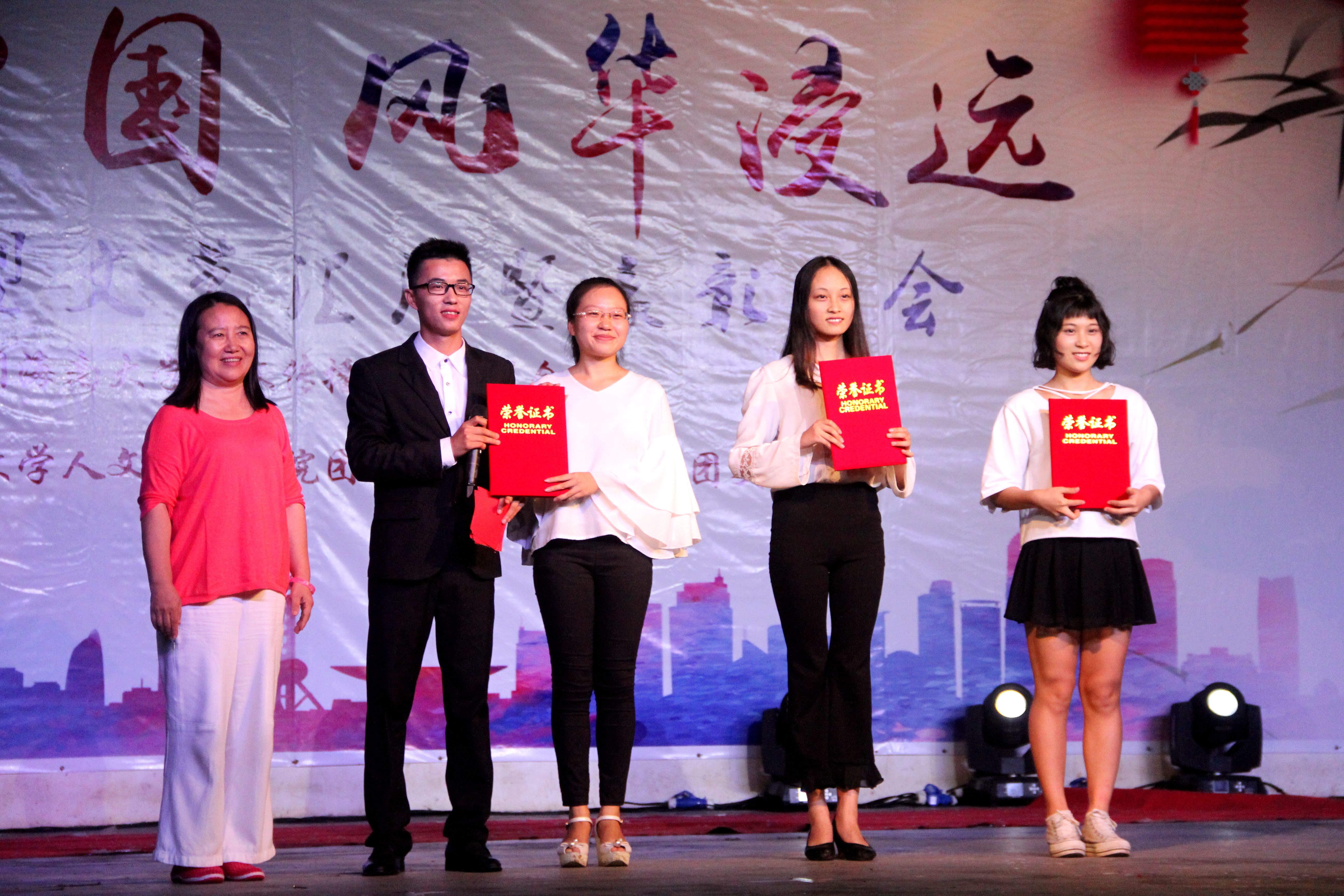 本次晚会中还对人文传播学院荣获校级的“优秀共青团员”、“优秀共青团干部”、“优秀学生会干部”、“五四红旗团支部”以及暑期社会实践及志愿服务先进集体和个人给予表彰。