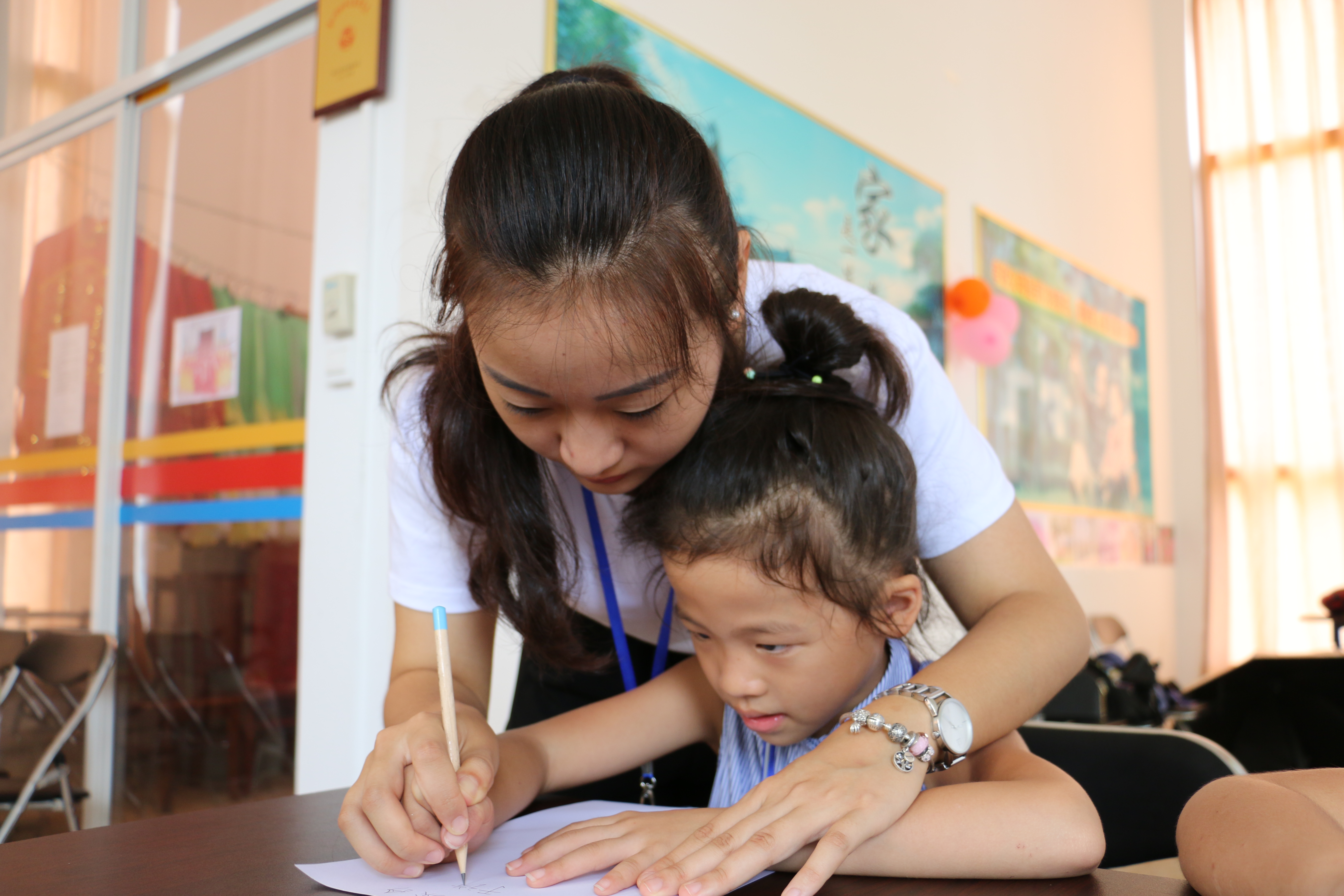 每天上午9点不到,孩子们便来到了社区活动室,安静的在座位上完成暑假作业或做手工,等待着志愿者们开始教学。第一时段是朗诵课,教学内容大都以古诗名篇为主,通过介绍诗作背景并播放相关视频,孩子们对古诗有了更深入的理解。伴随着孩子们稚嫩而童真的朗读声,一天的活动就这样开始了。随后进行的是书法教学。志愿者从纠正孩子们的坐姿与握笔姿势开始,还有常用笔画的练习,孩子们都能在志愿者的带领下静心书写,在一笔一画中学习汉字的框架与结构,感受汉字文化的魅力。