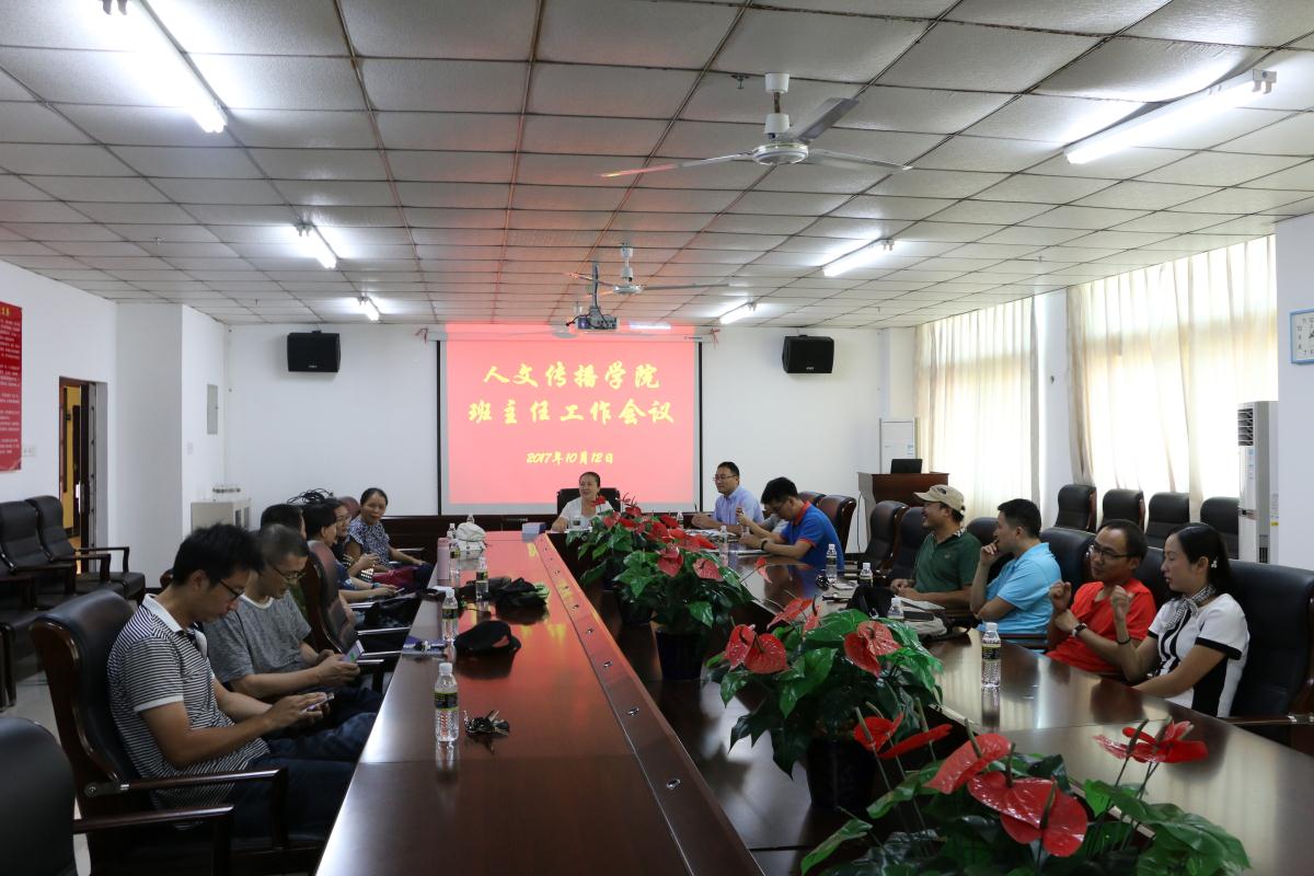 10月12日下午,人文传播学院召开班主任工作会议,学习贯彻学校安全稳定工作会议精神,部署安排十九大期间及本学期的班级工作。人文传播学院党委孙晓媛副书记主持会议,学工办主任公衍峰、团委书记熊文军及全体班主任参加了会议。 会上,孙晓媛副书记首先传达了黑料正能量