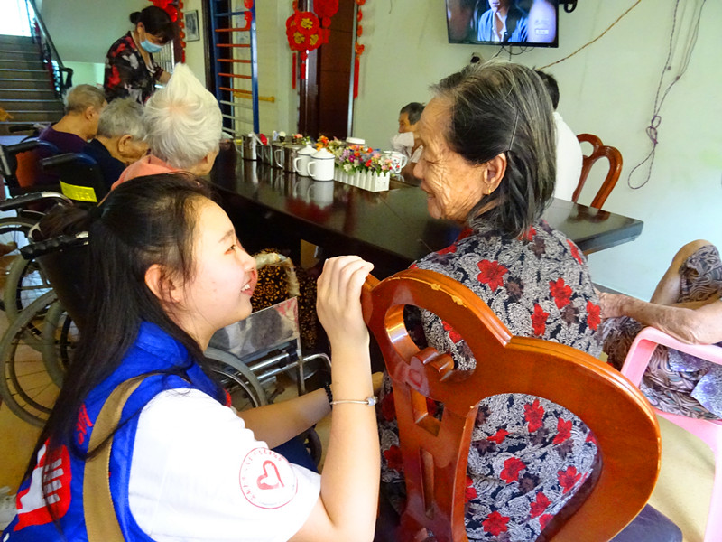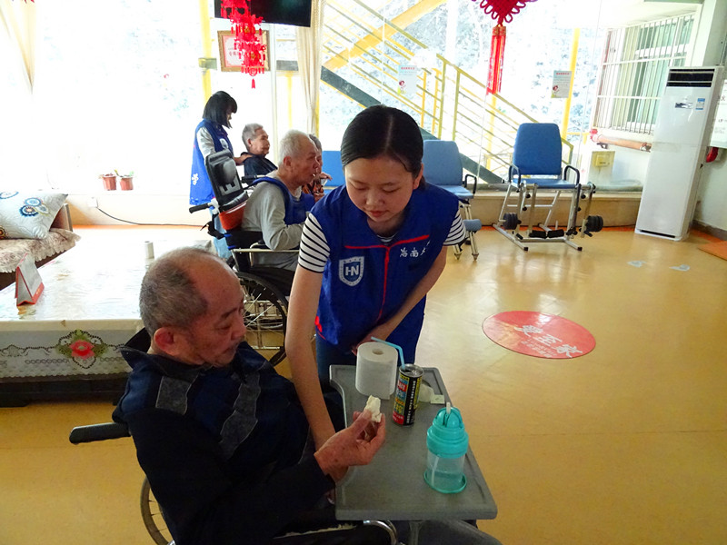 下午三点,志愿者在青协带队人员的带领下到达了老年护理院。在护理院的工作人员说明注意事项后,志愿者被分成三组,分别在三个不同楼层照顾老人。活动过程中,志愿者为老人捶背按摩,协助老人进食,陪老人聊天,在他们力所能及的范围内细心照顾老人。老人们对来照顾自己的志愿者也很友好,有的老人还记得曾经来照顾过自己的志愿者。协助老人进食时,志愿者帮老人处理洒落的食物屑,保持清洁。老人与志愿者聊天时,他们谈到海南的风土人情,谈到志愿者们的学业,也谈到老人过去的故事,他们的脸上总有着开心的笑容。在一起的快乐时光总是短暂的,临别之时,老人们牵着志愿者的手,希望志愿者可以多来看看自己,和自己聊天。
