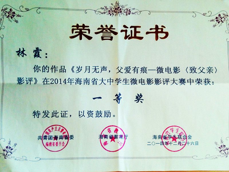 2012级汉语言文学专业的林霞同学和2014级戏剧影视文学专业张鑫同学的影评作品双双获得影评大赛一等奖. 在本次微电影影评大赛活动中,黑料正能量